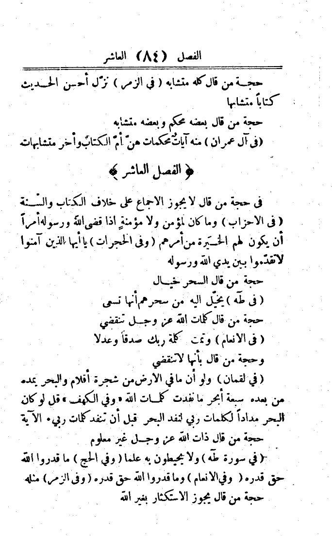 فِي حجَّة من قَالَ لَا يجوز الاجماع على خلاف الْكتاب وَالسّنة فِي الاحزاب {وَمَا كَانَ لمُؤْمِن وَلَا مُؤمنَة إِذا قضى الله وَرَسُوله أمرا أَن يكون لَهُم الْخيرَة من أَمرهم} وَفِي الحجرات {يَا أَيهَا الَّذين آمنُوا لَا تقدمُوا بَين يَدي الله وَرَسُوله}