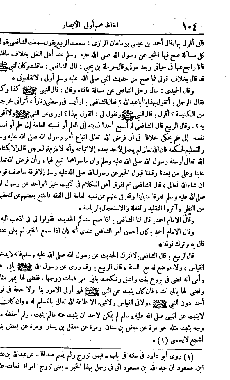 وَقَالَ الْحميدِي سَأَلَ رجل الشَّافِعِي عَن مَسْأَلَة فأفتاه وَقَالَ قَالَ النَّبِي صلى الله عَلَيْهِ وَسلم كَذَا وَكَذَا فَقَالَ الرجل أَتَقول بِهَذَا يَا أَبَا عبد الله فَقَالَ الشَّافِعِي أَرَأَيْت فِي وسطي زنارا أَترَانِي خرجت من الْكَنِيسَة أَقُول قَالَ النَّبِي صلى الله عَلَيْهِ وَسلم وَتقول لي أَتَقول بِهَذَا أروي عَن النَّبِي صلى الله عَلَيْهِ وَسلم وَلَا أَقُول بِهِ وَقَالَ الرّبيع قَالَ الشَّافِعِي لم أسمع أحدا نسبته إِلَى الْعلم اَوْ نسبته الْعَامَّة إِلَى علم أَو نسب نَفسه إِلَى علم يحْكى خلافًا فِي أَن فرض الله تَعَالَى اتِّبَاع أَمر رَسُول الله صلى الله عَلَيْهِ وَسلم وَالتَّسْلِيم لحكمه فَإِن الله تَعَالَى لم يَجْعَل لأحد بعده إِلَّا اتِّبَاعه وَأَنه لَا يلْزم قَول رجل قَالَ إِلَّا بِكِتَاب الله تَعَالَى أَو سنة رَسُول الله صلى الله عَلَيْهِ وَسلم وَأَن مَا سواهُمَا تبع لَهما وَأَن فرض الله تَعَالَى علينا وعَلى من بَعدنَا وَقَبلنَا قبُول الْخَبَر عَن رَسُول الله صلى الله عَلَيْهِ وَسلم إِلَّا فرقة سأصف قَوْلهَا إِن شَاءَ الله تَعَالَى قَالَ الشَّافِعِي ثمَّ تفرق أهل الْكَلَام فِي تثبيت خبر الْوَاحِد عَن رَسُول الله صلى الله عَلَيْهِ وَسلم تفَرقا متباينا وتفرق عَنْهُم مِمَّن نسبه الْعَامَّة إِلَى الْفِقْه فَامْتنعَ بَعضهم عَن التَّحْقِيق من النّظر وآثروا التَّقْلِيد والغفلة والاستعجال بالرياسة