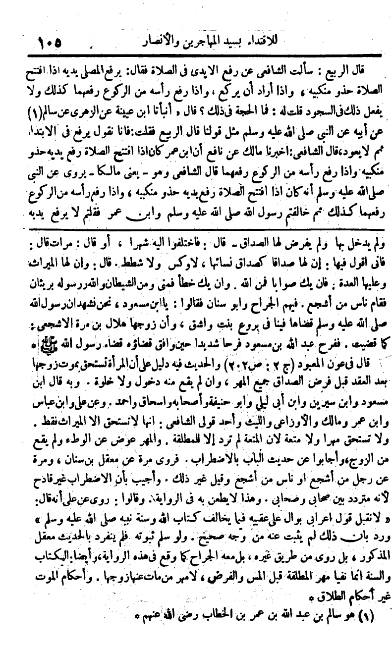 قَالَ الرّبيع سَأَلت الشَّافِعِي عَن رفع الْأَيْدِي فِي الصَّلَاة فَقَالَ يرفع الْمُصَلِّي يَدَيْهِ اذا افْتتح الصَّلَاة حَذْو مَنْكِبَيْه واذا أَرَادَ أَن يرْكَع وَإِذا رفع رَأسه من الرُّكُوع رفعهما كَذَلِك وَلَا يفعل ذَلِك فِي السُّجُود قلت لَهُ فَمَا الْحجَّة فِي ذَلِك قَالَ أَنبأَنَا ابْن عُيَيْنَة عَن الزُّهْرِيّ عَن سَالم عَن أَبِيه عَن النَّبِي صلى الله عَلَيْهِ وَسلم مثل قَوْلنَا قَالَ الرّبيع فَقلت فَإنَّا نقُول يرفع فِي الِابْتِدَاء ثمَّ لَا يعود قَالَ الشَّافِعِي أخبرنَا مَالك عَن نَافِع أَن ابْن عمر كَانَ اذا افْتتح الصَّلَاة رفع يَدَيْهِ حَذْو مَنْكِبَيْه واذا رفع رَأسه من الرُّكُوع رفعهما قَالَ الشَّافِعِي وَهُوَ يَعْنِي مَالِكًا يروي عَن النَّبِي صلى الله عَلَيْهِ وَسلم أَنه كَانَ اذا افْتتح الصَّلَاة رفع يَدَيْهِ حَذْو مَنْكِبَيْه واذا رفع رَأسه من الرُّكُوع رفعهما كَذَلِك ثمَّ خالفتم رَسُول الله صلى الله عَلَيْهِ وَسلم وَابْن عمر فقلتم لَا يرفع يَدَيْهِ