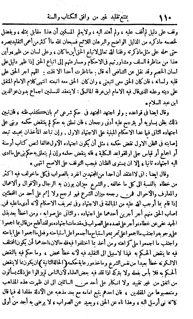 وَقَالَ أَيْضا إِنِّي لَا أعتقد أَن أحدا من الْمُجْتَهدين انْفَرد بِالصَّوَابِ فِي كل مَا خُولِفَ فِيهِ أَكثر من خطاه بِالنِّسْبَةِ الى كل مَا خَالفه وَالشَّرْع ميزَان يُوزن بِهِ الرِّجَال والأقوال والأعمال والمعارف وَالْأَحْوَال فَمن رَجحه ميزَان الشَّرْع فَهُوَ أرجح وَلَا إِثْم على أحد من المخطئين إِذا قَامَ بِمَا أوجب الله عَلَيْهِ من الْمُبَالغَة فِي الِاجْتِهَاد وَفِي تَعْرِيف الاحكام لِأَنَّهُ أدّى مَا عَلَيْهِ فَمن أصَاب الْحق مِنْهُم أجر أَجْرَيْنِ أَحدهمَا على إجتهاده وَالثَّانِي على صَوَابه وَمن أَخطَأ بعد بذل الْجهد عُفيَ عَن خطأه وَأجر على قَصده على الصَّوَاب فِي مُقَدمَات اجْتِهَاده وَلَقَد أَفْلح من قَالَ بِمَا أَجمعُوا على وُجُوبه واجتنب مَا أَجمعُوا على تَحْرِيمه واستباح مَا أَجمعُوا على استباحته وَفعل مَا أَجمعُوا على اباحته واجتنب مَا اجْمَعُوا على كَرَاهَته وَمن أَخذ بِمَا اخْتلفُوا فِيهِ فَلهُ حالان أح على كَرَاهَته وَمن أَخذ بِمَا اخْتلفُوا فِيهِ فَلهُ حالان أَحدهمَا أَن يكون الْمُخْتَلف فِيهِ مِمَّا ينْقض الحكم بِهِ فَهَذَا لَا سَبِيل الى التَّقْلِيد فِيهِ لِأَنَّهُ خطأ مَحْض وَمَا حكم فِيهِ بِالنَّقْضِ الا لكَونه خطأ بَعيدا من نفس الشَّرْع وماخذه ورعاية حكمه الْحَالة الثَّانِيَة أَن يكون مِمَّا لَا ينْقض الحكم بِهِ فَلَا بَأْس بِفِعْلِهِ وَلَا بِتَرْكِهِ إِذا قلد فِيهِ بعض الْعلمَاء لِأَن النَّاس لم يزَالُوا على ذَلِك يسْأَلُون من اتّفق من غير تَقْيِيد وَلَا انكار على أحد من السَّائِلين الى أَن ظَهرت هَذِه الْمذَاهب ومتعصبوها من المقلدين فَإِن أحدهم يتبع امامه مَعَ بعد مذْهبه عَن الْأَدِلَّة مُقَلدًا لَهُ فِيمَا قَالَ كَأَنَّهُ نَبِي أرسل اليه وَهَذَا ناء عَن الْحق وبعيد عَن الصَّوَاب لَا يرضى بِهِ أحد من أولي
