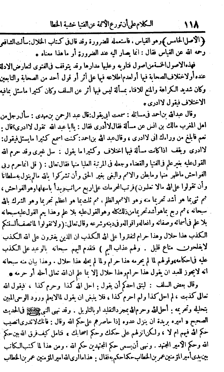 وَقَالَ عبد الله بن أَحْمد فِي مسَائِله سَمِعت أبي يَقُول قَالَ عبد الرحمن بن مهْدي سَأَلَ رجل من اهل الْمغرب مَالك بن أنس عَن مَسْأَلَة فَقَالَ لَا أَدْرِي فَقَالَ يَا أَبَا عبد الله تَقول لَا أَدْرِي قَالَ نعم فأبلغ من وَرَاءَك أَنِّي لَا أَدْرِي وَقَالَ عبد الله بن أَحْمد كنت أسمع كثيرا مَا يسئل فَيَقُول لَا أَدْرِي وَيقف إِذا كَانَت مَسْأَلَة فِيهَا اخْتِلَاف وَكَثِيرًا مَا يَقُول سل غَيْرِي وَقد حرم الله القَوْل عَلَيْهِ بِغَيْر علم فِي الْفتيا وَالْقَضَاء وَجعله فِي المرتية الْعليا مِنْهَا فَقَالَ تَعَالَى {قل إِنَّمَا حرم رَبِّي الْفَوَاحِش مَا ظهر مِنْهَا وَمَا بطن وَالْإِثْم وَالْبَغي بِغَيْر الْحق وَأَن تُشْرِكُوا بِاللَّه مَا لم ينزل بِهِ سُلْطَانا وَأَن تَقولُوا على الله مَا لَا تعلمُونَ} فرتب الْمُحرمَات على أَربع مَرَاتِب وَبَدَأَ بأسهلها وَهُوَ الْفَوَاحِش ثمَّ ثني بِمَا هُوَ أَشد تَحْرِيمًا مِنْهُ وَهُوَ الْإِثْم وَالظُّلم ثمَّ ثلث بِمَا هُوَ أعظم تَحْرِيمًا وَهُوَ الشّرك بِاللَّه سُبْحَانَهُ ثمَّ ربع بِمَا هُوَ أَشد تَحْرِيمًا من ذَلِك كُله وَهُوَ القَوْل عَلَيْهِ بِلَا علم وَهَذَا يعم القَوْل عَلَيْهِ سُبْحَانَهُ بِلَا علم فِي أَسْمَائِهِ وَصِفَاته وأفعاله وأقواله وَفِي دينه وشرعه وَقَالَ تَعَالَى {وَلَا تَقولُوا لما تصف أَلْسِنَتكُم الْكَذِب هَذَا حَلَال وَهَذَا حرَام لتفتروا على الله الْكَذِب إِن الَّذين يفترون على الله الْكَذِب لَا يفلحون مَتَاع قَلِيل وَلَهُم عَذَاب أَلِيم} فَتقدم إِلَيْهِم سُبْحَانَهُ بالوعيد على الْكَذِب عَلَيْهِ فِي أَحْكَامه وَقَوْلهمْ لما لم يحرمه هَذَا حرَام وَلما لم يحله هَذَا حَلَال وَهَذَا بَيَان مِنْهُ سُبْحَانَهُ أَنه لَا يجوز للْعَبد أَن يَقُول هَذَا حرَام وَهَذَا حَلَال إِلَّا بِمَا علم أَن الله تَعَالَى أحله أَو حرمه