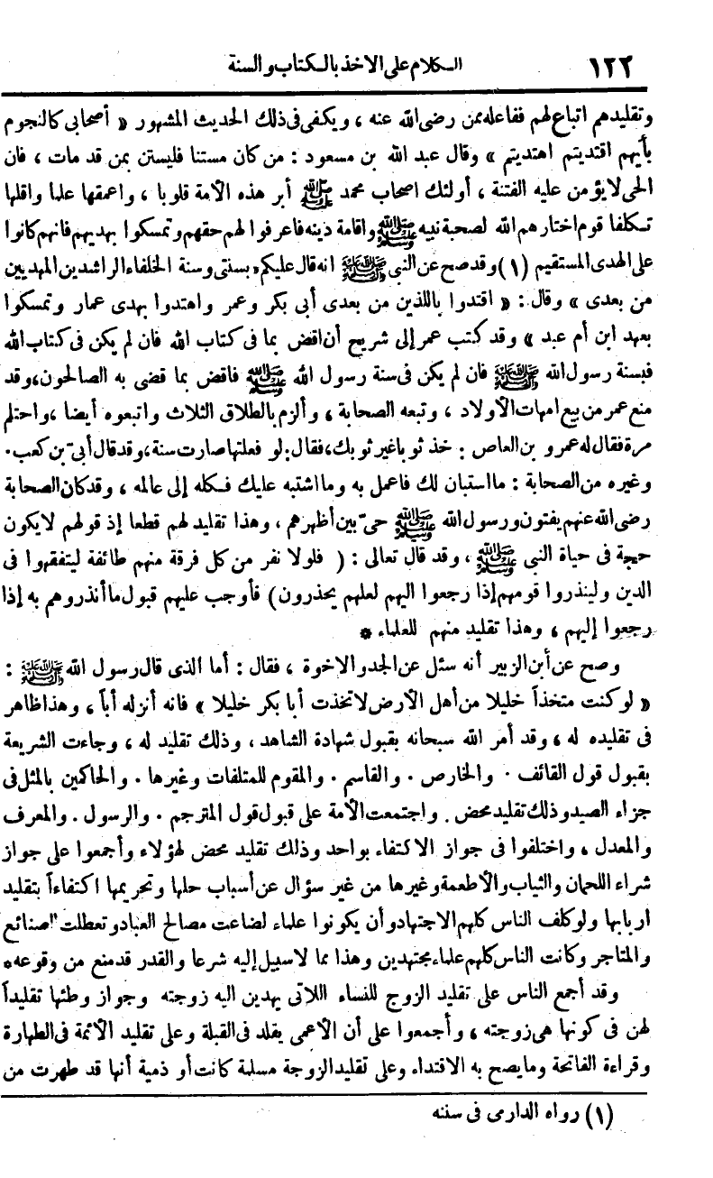 وتقليدهم اتِّبَاع لَهُم ففاعله مِمَّن رَضِي الله عَنهُ وَيَكْفِي فِي ذَلِك الحَدِيث الْمَشْهُور أَصْحَابِي كَالنُّجُومِ بِأَيِّهِمْ اقْتَدَيْتُمْ اهْتَدَيْتُمْ وَقَالَ عبد الله بن مَسْعُود من كَانَ مستنا فَليَسْتَنَّ بِمن قد مَاتَ فَإِن الْحَيّ لَا يُؤمن عَلَيْهِ الْفِتْنَة أُولَئِكَ أَصْحَاب مُحَمَّد صلى الله عَلَيْهِ وَسلم أبر هَذِه الْأمة قلوبا وأعمقها علما وأقلها تكلفا قوم اخْتَارَهُمْ الله لصحبة نبيه ص وَإِقَامَة دينه فاعرفوا لَهُم حَقهم وتمسكوا بهديهم فَإِنَّهُم كَانُوا على الْهدى الْمُسْتَقيم وَقد صَحَّ عَن النَّبِي صلى الله عَلَيْهِ وَسلم أَنه قَالَ عَلَيْكُم بِسنتي وَسنة الْخُلَفَاء الرَّاشِدين المهديين من بعدِي وَقَالَ اقتدوا بالذين من بعدِي أبي بكر وَعمر واهتدوا بِهَدي عمار وتمسكوا بِعَهْد ابْن أم عبد وَقد كتب عمر إِلَى شُرَيْح أَن اقْضِ بِمَا فِي كتاب الله فَإِن لم يكن فِي كتاب الله فبسنة رَسُول الله صلى الله عَلَيْهِ وَسلم فَإِن لم يكن فِي سنة رَسُول الله صلى الله عَلَيْهِ وَسلم فَاقْض بِمَا قضى بِهِ الصالحون وَقد منع عمر من بيع أُمَّهَات الْأَوْلَاد وَتَبعهُ الصَّحَابَة وألزم بِالطَّلَاق الثَّلَاث واتبعوه أَيْضا واحتلم مرّة فَقَالَ لَهُ عَمْرو بن الْعَاصِ خُذ ثوبا غير ثَوْبك فَقَالَ لَو فعلتها صَارَت سنة وَقد قَالَ أبي بن كَعْب وَغَيره من الصَّحَابَة مَا استبان لَك فاعمل بِهِ وَمَا اشْتبهَ عَلَيْك فكله إِلَى عالمه وَقد كَانَ الصَّحَابَة رَضِي الله عَنْهُم يفتون وَرَسُول الله صلى الله عَلَيْهِ وَسلم حَيّ بَين أظهرهم وَهَذَا تَقْلِيد لَهُم قطعا إِذْ قَوْلهم لَا يكون حجَّة فِي حَيَاة النَّبِي صلى الله عَلَيْهِ وَسلم وَقد قَالَ تَعَالَى {فلولا نفر من كل فرقة مِنْهُم طَائِفَة ليتفقهوا فِي الدّين ولينذروا قَومهمْ إِذا رجعُوا إِلَيْهِم لَعَلَّهُم يحذرون} فَأوجب عَلَيْهِم قبُول ماأنذروهم بِهِ إِذا رجعُوا إِلَيْهِم وَهَذَا تَقْلِيد مِنْهُم للْعُلَمَاء