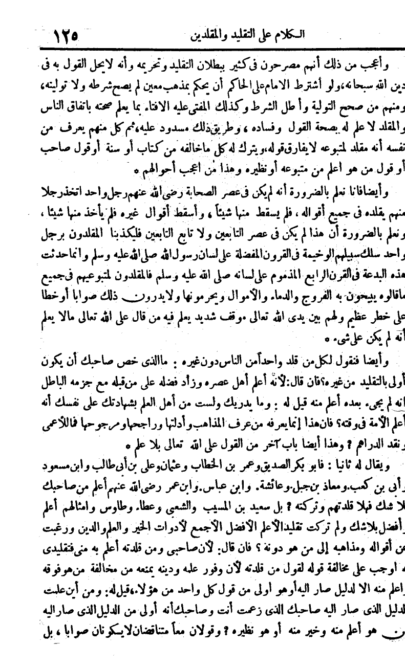 وَيُقَال لَهُ ثَانِيًا فَأَبُو بكر الصّديق وَعمر بن الْخطاب وَعُثْمَان وَعلي بن أبي طَالب وَابْن مَسْعُود وَأبي بن كَعْب ومعاذ بن جبل وَعَائِشَة وَابْن عَبَّاس وَابْن عمر رَضِي الله عَنْهُم أعلم من صَاحبك بِلَا شكّ فَهَلا قلتدهم وَتركته بل سعيد بن الْمسيب وَالشعْبِيّ وَعَطَاء وَطَاوُس وأمثالهم أعلم وَأفضل بِلَا شكّ وَلم تركت تَقْلِيد الأعلم الْأَفْضَل الأجمع لأدوات الْخَيْر وَالْعلم وَالدّين ورغبت عَن أَقْوَاله ومذاهبه إِلَى من هُوَ دونه فان قَالَ لِأَن صَاحِبي وَمن قلدته أعلم بِهِ مني فتقليدي لَهُ أوجب على مُخَالفَة قَوْله لقَوْل من قلدته لِأَن وفور علمه وَدينه يمنعهُ من مُخَالفَة من هُوَ فَوْقه وَأعلم مِنْهُ الا لدَلِيل صَار اليه أَو هُوَ أولى من قَول كل وَاحِد من هَؤُلَاءِ قيل لَهُ وَمن أَيْن علمت الدَّلِيل الَّذِي صَار اليه صَاحبك الَّذِي زعمت أَنْت وَصَاحِبك أَنه أولى من الدَّلِيل الَّذِي صَار اليه من هُوَ أعلم مِنْهُ وَخير مِنْهُ أَو هُوَ نَظِيره وقولان مَعًا متناقضان لَا يكونَانِ صَوَابا بل