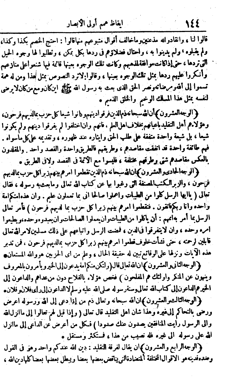 الْوَجْه الثَّانِي وَالْعشْرُونَ أَن الله تَعَالَى قَالَ {ولتكن مِنْكُم أمة يدعونَ إِلَى الْخَيْر ويأمرون بِالْمَعْرُوفِ وَينْهَوْنَ عَن الْمُنكر وَأُولَئِكَ هم المفلحون} فَخص هَؤُلَاءِ بالفلاح دون من عداهم والداعون إِلَى الْخَيْر هم الداعون إِلَى كتاب الله تَعَالَى وَسنة رَسُوله ص لَا الداعون إِلَى رَأْي فلَان وَفُلَان