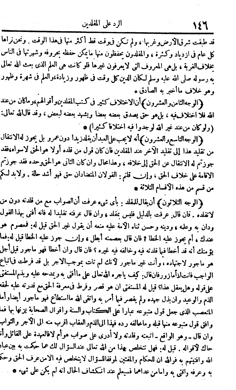 الْوَجْه التَّاسِع وَالْعشْرُونَ أَنه لَا يجب على العَبْد أَن يُقَلّد زيدا دون عَمْرو بل يجوز لَهُ الِانْتِقَال من تَقْلِيد هَذَا إِلَى تَقْلِيد الآخر عِنْد المقلدين فَإِن كَانَ قَول من قَلّدهُ أَولا هُوَ الْحق لَا سواهُ فقد جوزتم لَهُ الِانْتِقَال عَن الْحق إِلَى خِلَافه وَهَذَا محَال وَإِن كَانَ الثَّانِي هُوَ الْحق وَحده فقد جوزتم الْإِقَامَة على خلاف الْحق وَإِن قُلْتُمْ الْقَوْلَانِ المتضادان حق فَهُوَ أَشد حَالَة وَلَا بُد لكم من قسم من هَذِه الْأَقْسَام الثَّلَاثَة