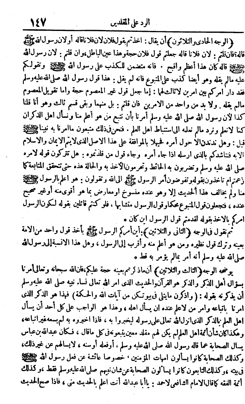 يُوضحهُ الْوَجْه الثَّالِث وَالثَّلَاثِينَ أَن مَا ذكرْتُمْ بِعَيْنِه حجَّة عَلَيْكُم فَإِن الله سُبْحَانَهُ وَتَعَالَى أمرنَا بسؤال أهل الذّكر وَالذكر هُوَ الْقُرْآن والْحَدِيث الَّذِي أَمر الله تَعَالَى نسَاء نبيه ص أَن يذكرنه بقوله {واذكرن مَا يُتْلَى فِي بيوتكن من آيَات الله وَالْحكمَة} فَهَذَا هُوَ الذّكر الَّذِي أمرنَا باتباعه وَأمر من لَا علم عِنْده أَن يسْأَل أَهله وَهَذَا هُوَ الْوَاجِب على كل أحد أَن يسْأَل اهل الْعلم بِالذكر الَّذِي أنزل الله تَعَالَى على رَسُوله ليخبروا بِهِ فَإِذا أَخْبرُوهُ بِهِ لم يَسعهُ غير اتِّبَاعه وَهَكَذَا كَانَ شَأْن أَئِمَّة أهل الْعلم لم يكن لَهُم مقلد معِين يتبعونه فِي كل مَا قَالَ فَكَانَ عبد الله بن عَبَّاس يسْأَل الصَّحَابَة عَمَّا قَالَه رَسُول الله صلى الله عَلَيْهِ وَسلم أَو فعله أَو سنه لَا يسألهم عَن غير ذَلِك وَكَذَلِكَ الصَّحَابَة كَانُوا يسْأَلُون أُمَّهَات الْمُؤمنِينَ خُصُوصا عَائِشَة عَن فعل رَسُول الله صلى الله عَلَيْهِ وَسلم فِي بَيته وَكَذَلِكَ التابعون كَانُوا يسْأَلُون الصَّحَابَة عَن شَأْن نَبِيّهم ص فَقَط وَكَذَلِكَ أَئِمَّة الْفِقْه كَمَا قَالَ الإِمَام الشَّافِعِي لِأَحْمَد يَا أَبَا عبد الله أَنْت أعلم بِالْحَدِيثِ مني فَإِذا صَحَّ الحَدِيث