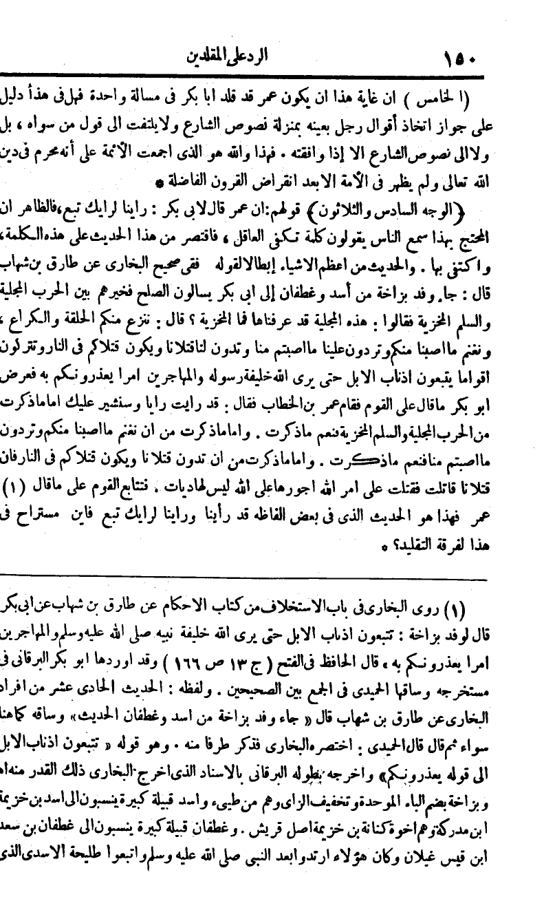 الْوَجْه السَّادِس وَالثَّلَاثُونَ قَوْلهم أَن عمر قَالَ لأبي بكر رَأينَا لرأيك تبع فَالظَّاهِر أَن المحتج بِهَذَا سمع النَّاس يَقُولُونَ كلمة تَكْفِي الْعَاقِل فاقتصر من هَذَا الحَدِيث على هَذِه الْكَلِمَة وَاكْتفى بهَا والْحَدِيث من أعظم الْأَشْيَاء إبطالا لقَوْله فَفِي صَحِيح البُخَارِيّ عَن طَارق بن شهَاب قَالَ جَاءَ وَفد بزاخة من أَسد وغَطَفَان إِلَى أبي بكر يسْأَلُون الصُّلْح فَخَيرهمْ بَين الْحَرْب المجلية وَالسّلم المخزية فَقَالُوا هَذِه المجلية قد عرفناها فَمَا المخزية قَالَ ننزع مِنْكُم الْحلقَة والكراع ونغنم مَا أصبْنَا مِنْكُم وتردون علينا مَا أصبْتُم منا وتدون لنا قَتْلَانَا وَيكون قَتْلَاكُمْ فِي النَّار وتتركون أَقْوَامًا يتبعُون أَذْنَاب الْإِبِل حَتَّى يرى الله خَليفَة رَسُوله والمهاجرين أمرا يعذرونكم بِهِ فَعرض أَبُو بكر مَا قَالَ على الْقَوْم فَقَامَ عمر بن الْخطاب فَقَالَ قد رَأَيْت رَأيا وسنشير عَلَيْك أما مَا ذكرت من الْحَرْب المجلية وَالسّلم المخزية فَنعم مَا ذكرت وَأما مَا ذكرت من أَن نغنم مَا أصبْنَا مِنْكُم وتردون مَا أصبْتُم منا فَنعم مَا ذكرت وَأما مَا ذكرت من أَن تدون قَتْلَانَا وَيكون قَتْلَاكُمْ فِي النَّار فَإِن قَتْلَانَا قَاتَلت فقتلت على أَمر الله أجورها على الله لَيْسَ لَهَا ديات فتتابع الْقَوْم على مَا قَالَ عمر فَهَذَا هُوَ الحَدِيث الَّذِي فِي بعض أَلْفَاظه قد رَأينَا ورأينا لرأيك تبع فَأَيْنَ مستراح فِي هَذَا لفرقة التَّقْلِيد