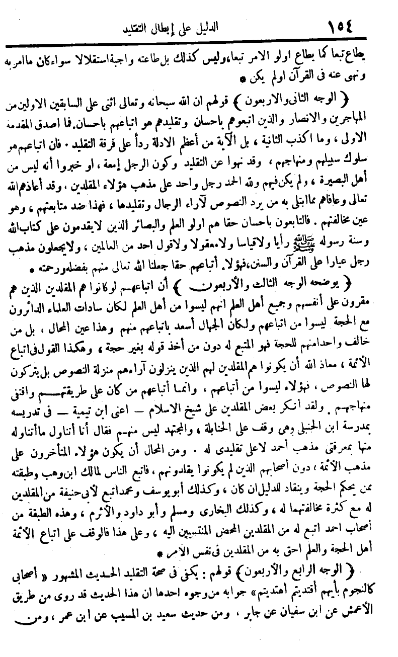 الْوَجْه الثَّانِي وَالْأَرْبَعُونَ قَوْلهم أَن الله سُبْحَانَهُ وَتَعَالَى أثنى على السَّابِقين الْأَوَّلين من الْمُهَاجِرين وَالْأَنْصَار وَالَّذين اتَّبَعُوهُمْ بِإِحْسَان وتقليدهم هُوَ اتباعهم بِإِحْسَان فَمَا أصدق الْمُقدمَة الأولى وَمَا أكذب الثَّانِيَة بل الْآيَة من أعظم الْأَدِلَّة ردا على فرقة التَّقْلِيد فَإِن اتباعهم هُوَ سلوك سبيلهم ومنهاجهم وَقد نهوا عَن التَّقْلِيد وَكَون الرجل إمعة أَو خبروا أَنه لَيْسَ من أهل البصيرة وَلم يكن فيهم وَللَّه الْحَمد رجل وَاحِد على مَذْهَب هَؤُلَاءِ المقلدين وَقد أعاذهم الله تَعَالَى وعافاهم مِمَّا ابْتُلِيَ بِهِ من يرد النُّصُوص لآراء الرِّجَال وتقليدها فَهَذَا ضد متابعتهم وَهُوَ عين مخالفتهم فالتابعون بِإِحْسَان حَقًا هم أولو الْعلم والبصائر الَّذين لَا يقدمُونَ على كتاب الله وَسنة رَسُوله ص رَأيا وَلَا قِيَاسا وَلَا معقولا وَلَا قَول أحد من الْعَالمين وَلَا يجْعَلُونَ مَذْهَب رجل عيارا على الْقُرْآن وَالسّنَن فَهَؤُلَاءِ أتباعهم حَقًا جعلنَا الله تَعَالَى مِنْهُم بفضله وَرَحمته