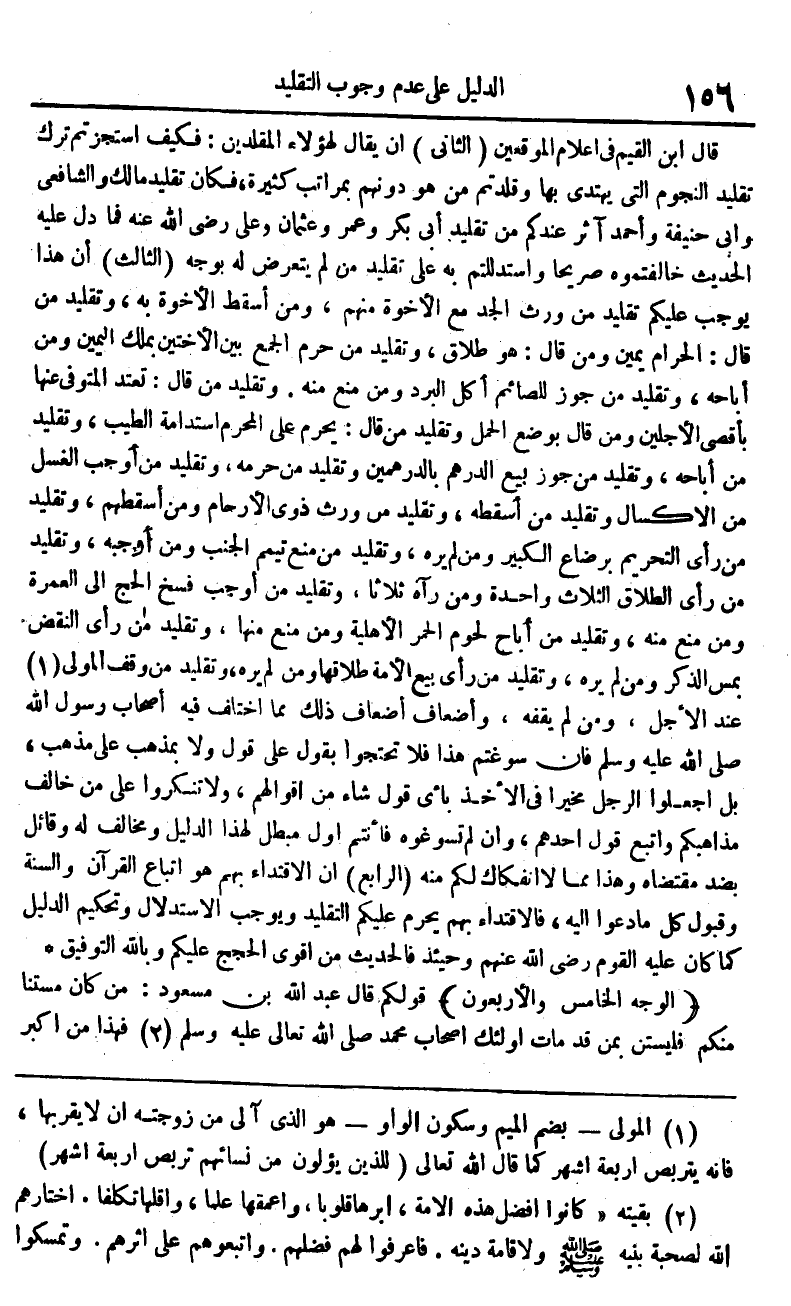 قَالَ ابْن الْقيم فِي أَعْلَام الموقعين الثَّانِي أَن يُقَال لهَؤُلَاء المقلدين فَكيف استجزتم ترك تَقْلِيد النُّجُوم الَّتِي يهتدى بهَا وقلدتم من هُوَ دونهم بمراتب كَثِيرَة فَكَانَ تَقْلِيد مَالك وَالشَّافِعِيّ وَأبي حنيفَة وَأحمد آثر عنْدكُمْ من تَقْلِيد أبي بكر وَعمر وَعُثْمَان وَعلي رَضِي الله عَنهُ فَمَا دلّ عَلَيْهِ الحَدِيث خالفتموه صَرِيحًا واستدللتم بِهِ على تَقْلِيد من لم يتَعَرَّض لَهُ بِوَجْه الثَّالِث أَن هَذَا يُوجب عَلَيْكُم تَقْلِيد من ورث الْجد مَعَ الْأُخوة مِنْهُم وَمن أسقط الْأُخوة بِهِ وتقليد من قَالَ الْحَرَام يَمِين وَمن قَالَ هُوَ طَلَاق وتقليد من حرم الْجمع بَين الْأُخْتَيْنِ بِملك الْيَمين وَمن أَبَاحَهُ وتقليد من جوز للصَّائِم أكل الْبرد وَمن منع مِنْهُ وتقليد من قَالَ تَعْتَد الْمُتَوفَّى عَنْهَا بأقصى الْأَجَليْنِ وَمن قَالَ بِوَضْع الْحمل وتقليد من قَالَ يحرم على الْمحرم اسْتِدَامَة الطّيب وتقليد من أَبَاحَهُ وتقليد من جوز بيع الدِّرْهَم بِالدِّرْهَمَيْنِ وتقليد من حرمه وتقليد من أوجب الْغسْل من الأكسال وتقليد من أسْقطه وتقليد من ورث ذَوي الْأَرْحَام وَمن أسقطهم وتقليد من رأى التَّحْرِيم برضاع الْكَبِير وَمن لم يره وتقليد من منع تيَمّم الْجنب وَمن أوجبه وتقليد من رأى الطَّلَاق الثَّلَاث وَاحِدَة وَمن رَآهُ ثَلَاثًا وتقليد من أوجب فسخ الْحَج إِلَى الْعمرَة وَمن منع مِنْهُ وتقليد من أَبَاحَ لُحُوم الْحمر الْأَهْلِيَّة وَمن منع مِنْهَا وتقليد من رأى النَّقْض بِمَسّ الذّكر وَمن لم يره وتقليد من رأى بيع الْأمة طَلاقهَا وَمن لم يره وتقليد من وقف الْمولى عِنْد الْأَجَل وَمن لم يقفه وأضعاف أَضْعَاف ذَلِك مِمَّا اخْتلف فِيهِ أَصْحَاب رَسُول الله صلى الله عَلَيْهِ وَسلم فَإِن سوغتم هَذَا فَلَا تحتجوا بقول على قَول وَلَا بِمذهب على مَذْهَب بل اجعلوا الرجل مُخَيّرا فِي الْأَخْذ بِأَيّ قَول شَاءَ من أَقْوَالهم وَلَا تنكروا على من خَالف مذاهبكم وَاتبع قَول أحدهم وَإِن لم تسوغوه فَأنْتم أول مُبْطل لهَذَا الدَّلِيل ومخالف لَهُ وَقَائِل بضد مُقْتَضَاهُ وَهَذَا مِمَّا لَا انفكاك لكم مِنْهُ الرَّابِع أَن الِاقْتِدَاء بهم هُوَ اتِّبَاع الْقُرْآن وَالسّنة وَقبُول كل مَا دعوا إِلَيْهِ فالاقتداء بهم يحرم عَلَيْكُم التَّقْلِيد وَيُوجب الِاسْتِدْلَال وتحكيم الدَّلِيل كَمَا كَانَ عَلَيْهِ الْقَوْم رَضِي الله عَنْهُم وَحِينَئِذٍ فَالْحَدِيث من أقوى الْحجَج عَلَيْكُم وَبِاللَّهِ التَّوْفِيق