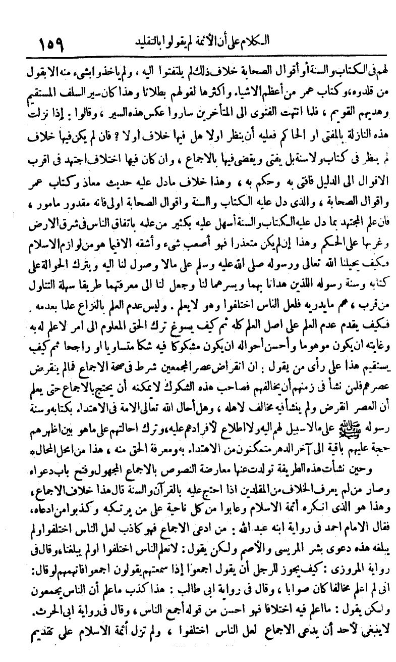 وَحين نشأت هَذِه الطَّرِيقَة تولدت عَنْهَا مُعَارضَة النُّصُوص بِالْإِجْمَاع الْمَجْهُول وَفتح بَاب دَعْوَاهُ وَصَارَ من لم يعرف الْخلاف من المقلدين إِذا احْتج عَلَيْهِ بِالْقُرْآنِ وَالسّنة قَالَ هَذَا خلاف الْإِجْمَاع وَهَذَا هُوَ الَّذِي أنكرهُ أَئِمَّة الْإِسْلَام وعابوا من كل نَاحيَة على من يرتكبه وكذبوا من ادَّعَاهُ فَقَالَ الإِمَام أَحْمد فِي رِوَايَة ابْنه عبد الله من ادّعى الْإِجْمَاع فَهُوَ كَاذِب لَعَلَّ النَّاس اخْتلفُوا وَلم يبلغهُ هَذِه دَعْوَى بشر المريسي والأصم وَلَكِن يَقُول لَا نعلم النَّاس اخْتلفُوا أَو لم يبلغنَا وَقَالَ فِي رِوَايَة الْمروزِي كَيفَ يجوز للرجل أَن يَقُول أَجمعُوا إِذا سمعتهم يَقُولُونَ أَجمعُوا فَاتَّهمهُمْ لَو قَالَ إِنِّي لم أعلم مُخَالفا كَانَ صَوَابا وَقَالَ فِي رِوَايَة أبي طَالب هَذَا كذب مَا علم أَن النَّاس يجمعُونَ وَلَكِن يَقُول مَا أعلم فِيهِ اخْتِلَافا فَهُوَ أحسن من قَوْله أجمع النَّاس وَقَالَ فِي رِوَايَة أبي الْحَرْث لَا يَنْبَغِي لأحد أَن يَدعِي الْإِجْمَاع لَعَلَّ النَّاس اخْتلفُوا وَلم تزل أَئِمَّة الْإِسْلَام على تَقْدِيم