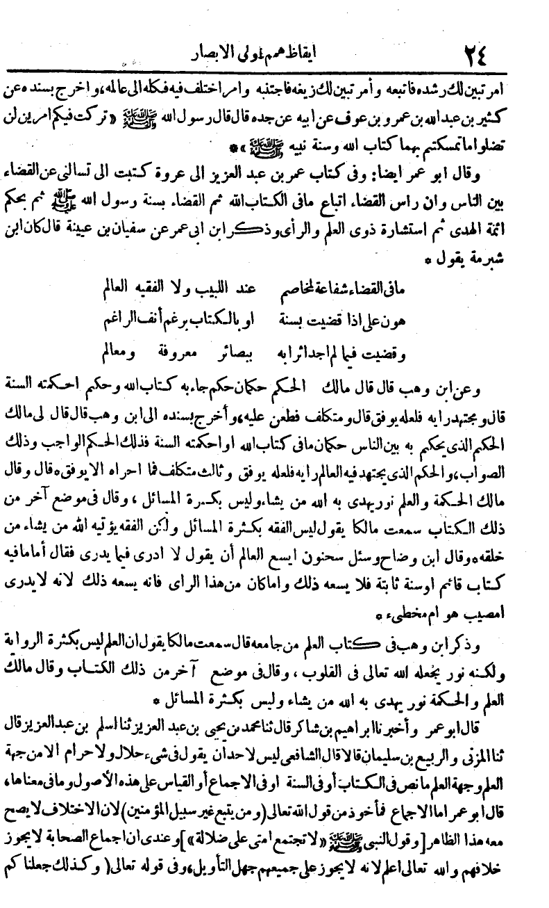 وَقَالَ أَبُو عمر أَيْضا وَفِي كتاب عمر بن عبد العزيز إِلَى عُرْوَة كتبت إِلَيّ تَسْأَلنِي عَن الْقَضَاء بَين النَّاس وَأَن رَأس الْقَضَاء اتِّبَاع مَا فِي كتاب الله ثمَّ الْقَضَاء بِسنة رَسُول الله صلى الله عَلَيْهِ وَسلم ثمَّ بِحكم أَئِمَّة الْهَدْي ثمَّ استشارة ذَوي الْعلم والرأي وَذكر ابْن أبي عمر عَن سُفْيَان بن عُيَيْنَة قَالَ كَانَ ابْن شبْرمَة يَقُول ... مَا فِي الْقَضَاء شَفَاعَة لمخاصم ... عِنْد اللبيب وَلَا الْفَقِيه الْعَالم