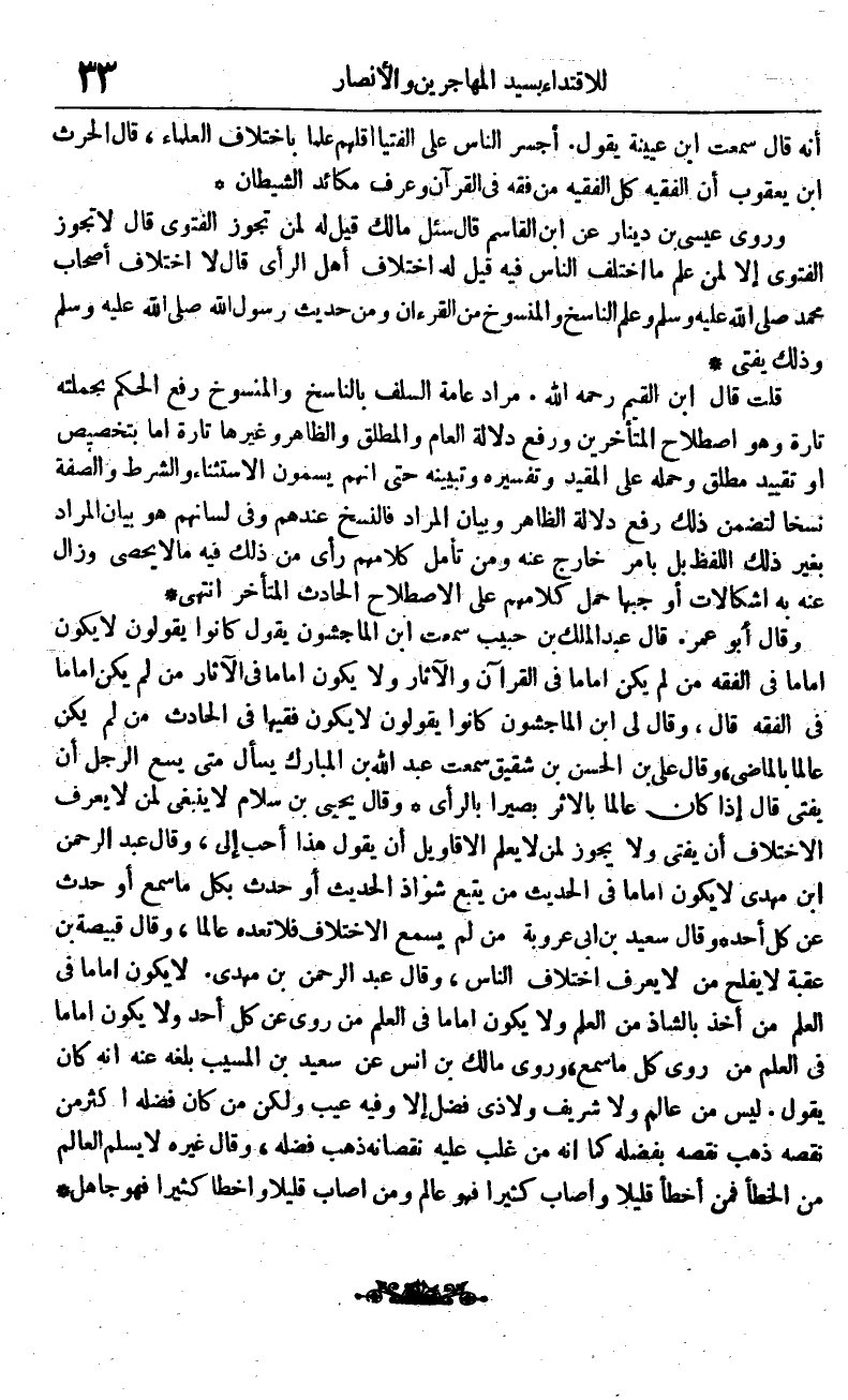 وَقَالَ أَبُو عمر قَالَ عبد الملك بن حبيب سَمِعت ابْن الْمَاجشون يَقُول كَانُوا يَقُولُونَ لَا يكون إِمَامًا فِي الْفِقْه من لم يكن إِمَامًا فِي الْقُرْآن والْآثَار وَلَا يكون إِمَامًا فِي الْآثَار من لم يكن إِمَامًا فِي الْفِقْه قَالَ وَقَالَ لي ابْن الْمَاجشون كَانُوا يَقُولُونَ لَا يكون فَقِيها فِي الْحَادِث من لم يكن عَالما بالماضي وَقَالَ عَليّ بن الْحسن بن شَقِيق سَمِعت عبد الله بن الْمُبَارك يسْأَل مَتى يسع الرجل أَن يُفْتِي قَالَ إِذا كَانَ عَالما بالأثر بَصيرًا بِالرَّأْيِ وَقَالَ يحيى بن سَلام لَا يَنْبَغِي لمن لَا يعرف الِاخْتِلَاف أَن يُفْتِي وَلَا يجوز لمن لَا يعلم الْأَقَاوِيل أَن يَقُول هَذَا أحب إِلَيّ وَقَالَ عبد الرحمن ابْن مهْدي لَا يكون إِمَامًا فِي الحَدِيث من يتبع شواذ الحَدِيث أَو حدث بِكُل مَا سمع أَو حدث عَن كل أحد وَقَالَ سعيد بن أبي عرُوبَة من لم يسمع الِاخْتِلَاف فَلَا تعده عَالما وَقَالَ قبيصَة بن عقبَة لَا يفلح من لَا يعرف اخْتِلَاف النَّاس وَقَالَ عبد الرحمن بن مهْدي لَا يكون إِمَامًا فِي الْعلم من أَخذ بالشاذ من الْعلم وَلَا يكون إِمَامًا فِي الْعلم من روى عَن كل أحد وَلَا يكون إِمَامًا فِي الْعلم من روى كل مَا سمع وروى مَالك بن أنس عَن سعيد بن الْمسيب بلغه عَنهُ أَنه كَانَ يَقُول لَيْسَ من عَالم وَلَا شرِيف وَلَا ذِي فضل إِلَّا وَفِيه عيب وَلَكِن من كَانَ فَضله أَكثر من نَقصه ذهب نَقصه بفضله كَمَا أَنه من غلب عَلَيْهِ نقصانه ذهب فَضله وَقَالَ غَيره لَا يسلم الْعَالم من الْخَطَأ فَمن أَخطَأ قَلِيلا وَأصَاب كثيرا فَهُوَ عَالم وَمن اصاب قَلِيلا وَأَخْطَأ كثيرا فَهُوَ جَاهِل