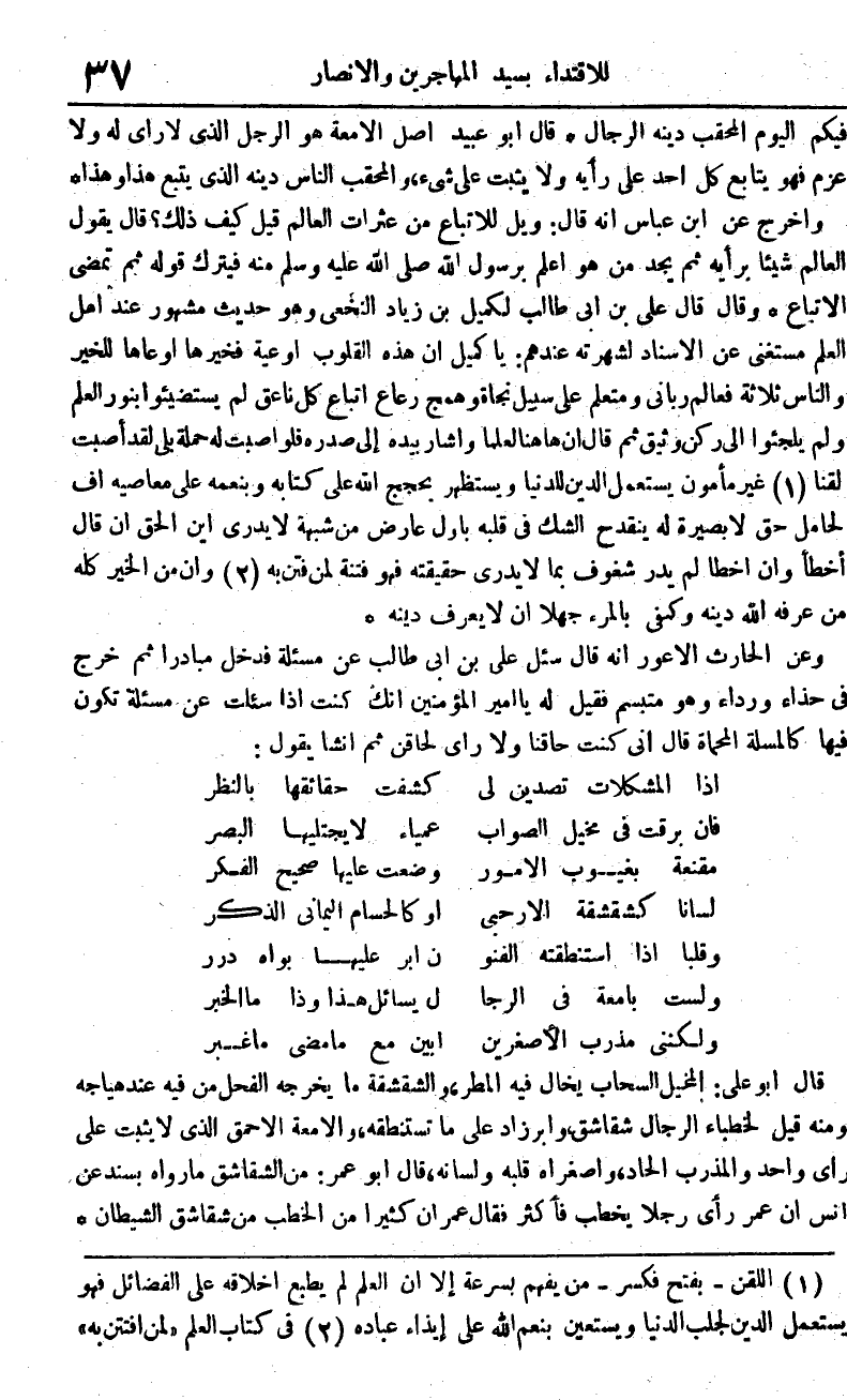 وَأخرج عَن ابْن عَبَّاس أَنه قَالَ ويل للأتباع من عثرات الْعَالم قيل كَيفَ ذَلِك قَالَ يَقُول الْعَالم شَيْئا بِرَأْيهِ ثمَّ يجد من هُوَ أعلم برَسُول الله صلى الله عَلَيْهِ وَسلم مِنْهُ فَيتْرك قَوْله ثمَّ تمْضِي الِاتِّبَاع وَقَالَ قَالَ عَليّ بن أبي طَالب لكميل بن زِيَاد النَّخعِيّ وَهُوَ حَدِيث مَشْهُور عِنْد أهل الْعلم مُسْتَغْنى عَن الْإِسْنَاد لشهرته عِنْدهم يَا كميل إِن هَذِه الْقُلُوب أوعية فَخَيرهَا أوعاها للخير وَالنَّاس ثَلَاثَة فعالم رباني ومتعلم على سَبِيل نجاة وهمج رعاع أَتبَاع كل ناعق لم يستضيئوا بِنور الْعلم وَلم يلجئوا إِلَى ركن وثيق ثمَّ قَالَ إِن هَاهُنَا لعلما وَأَشَارَ بِيَدِهِ إِلَى صَدره فَلَو أصبت لَهُ حَملَة بلَى لقد أصبت لقنا غير مَأْمُون يسْتَعْمل الدّين للدنيا ويستظهر بحجج الله على كِتَابه وبنعمه على مَعَاصيه أُفٍّ لحامل حق لَا بَصِيرَة لَهُ ينقدح الشَّك فِي قلبه بِأول عَارض من شُبْهَة لَا يدْرِي أَيْن الْحق إِن قَالَ أَخطَأ وَإِن أَخطَأ لم يدر شغوف بِمَا لَا يدْرِي حَقِيقَته فَهُوَ فتْنَة لمن فتن بِهِ وَإِن من الْخَيْر كُله من عرفه الله دينه وَكفى بِالْمَرْءِ جهلا أَن لَا يعرف دينه