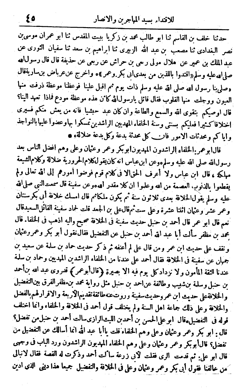 حَدثنَا خلف بن الْقَاسِم ثَنَا أَبُو طَالب مُحَمَّد بن زَكَرِيَّا بِبَيْت الْمُقَدّس ثَنَا أَبُو عمرَان مُوسَى بن نصر الْبَغْدَادِيّ ثَنَا مُصعب بن عبد الله الزبيرِي ثَنَا إِبْرَاهِيم بن سعد ثَنَا سُفْيَان الثَّوْريّ عَن عبد الملك بن عُمَيْر عَن هِلَال مولى ربعى بن حِرَاش عَن ربعى عَن حُذَيْفَة قَالَ قَالَ رَسُول الله صلى الله عَلَيْهِ وَسلم اقتدوا باللذين من بعدِي أبي بكر وَعمر وَأخرج عَن عرباض بن سَارِيَة قَالَ صلى بِنَا رَسُول الله صلى الله عَلَيْهِ وَسلم ذَات يَوْم ثمَّ أقبل علينا فوعظنا موعظة ذرفت مِنْهَا الْعُيُون ووجلت مِنْهَا الْقُلُوب فَقَالَ قَائِل يَا رَسُول الله كَأَن هَذِه موعظة مُودع فَمَاذَا تعهد إِلَيْنَا قَالَ أوصيكم بتقوى الله والسمع وَالطَّاعَة وَإِن كَانَ عبدا حَبَشِيًّا فَإِنَّهُ من يَعش مِنْكُم فسيرى اخْتِلَافا كثيرا فَعَلَيْكُم بِسنتي وَسنة الخفاء المهديين الرَّاشِدين تمسكوا بهَا وعضوا عَلَيْهَا بالنواجذ وَإِيَّاكُم ومحدثات الْأُمُور فَإِن كل محدثة بِدعَة وكل بِدعَة ضَلَالَة