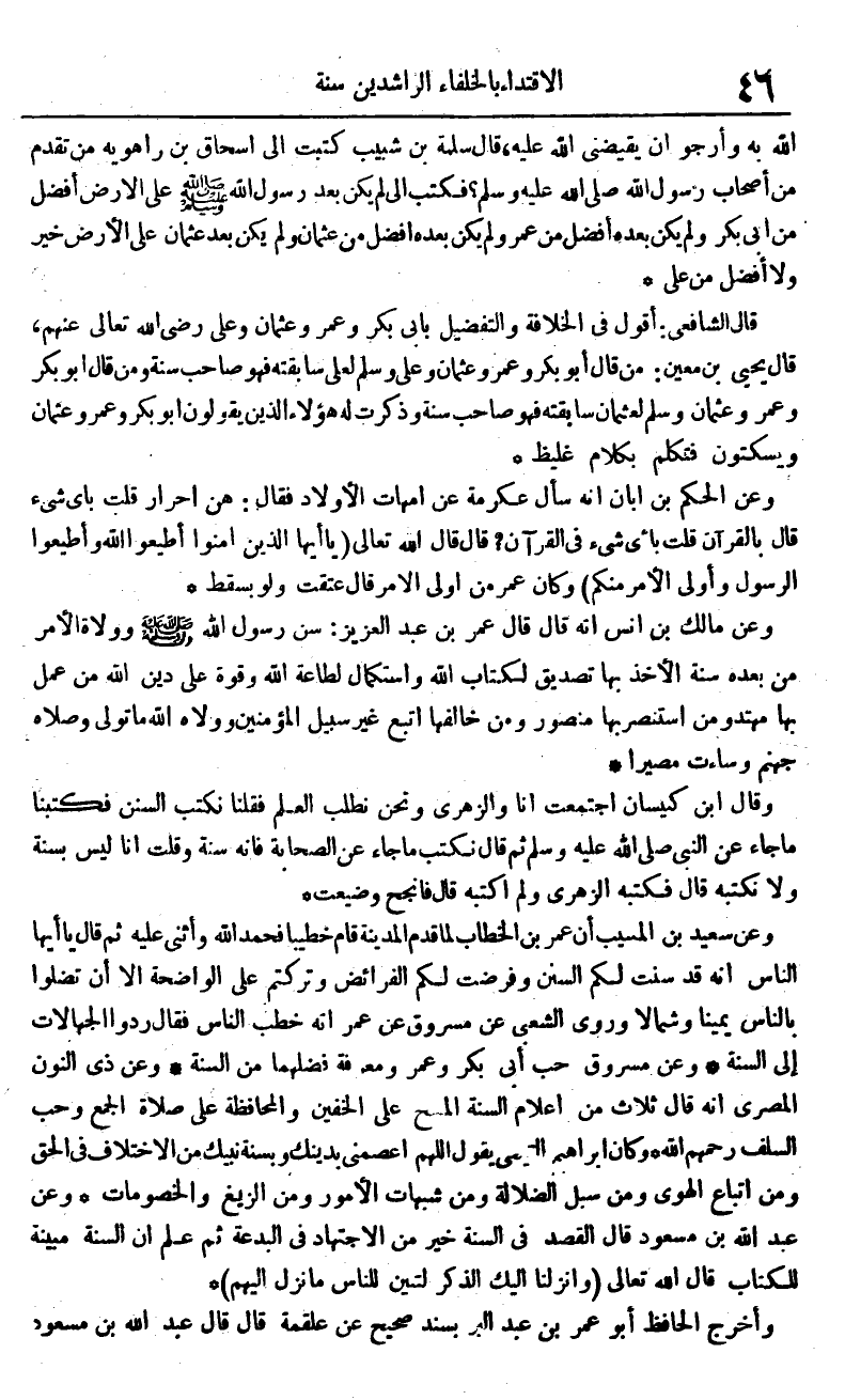وَعَن مَالك بن أنس أَنه قَالَ قَالَ عمر بن عبد العزيز سنّ رَسُول الله صلى الله عَلَيْهِ وَسلم وولاة الْأَمر من بعده سنة الْأَخْذ بهَا تَصْدِيق لكتاب الله واستكمال لطاعة الله وَقُوَّة على دين الله من عمل بهَا مهتد وَمن استنصر بهَا مَنْصُور وَمن خالفها اتبع غير سَبِيل الْمُؤمنِينَ وولاه الله مَا تولى وصلاه جَهَنَّم وَسَاءَتْ مصيرا