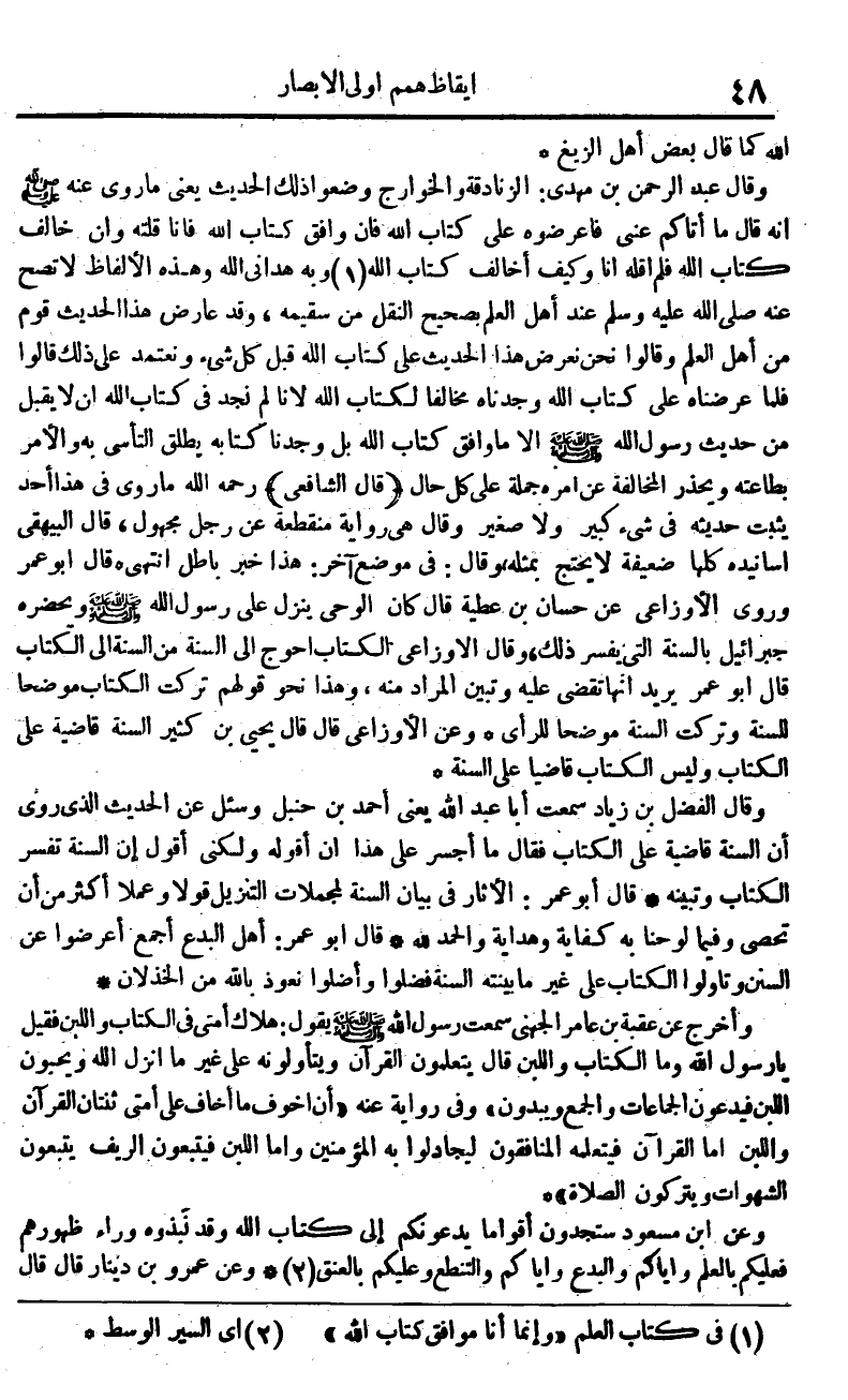 وَعَن ابْن مَسْعُود سَتَجِدُونَ أَقْوَامًا يدعونكم إِلَى كتاب الله وَقد نبذوه وَرَاء ظُهُورهمْ فَعَلَيْكُم بِالْعلمِ وَإِيَّاكُم والبدع وَإِيَّاكُم والتنطع وَعَلَيْكُم بالعنق وَعَن عَمْرو بن دِينَار قَالَ قَالَ