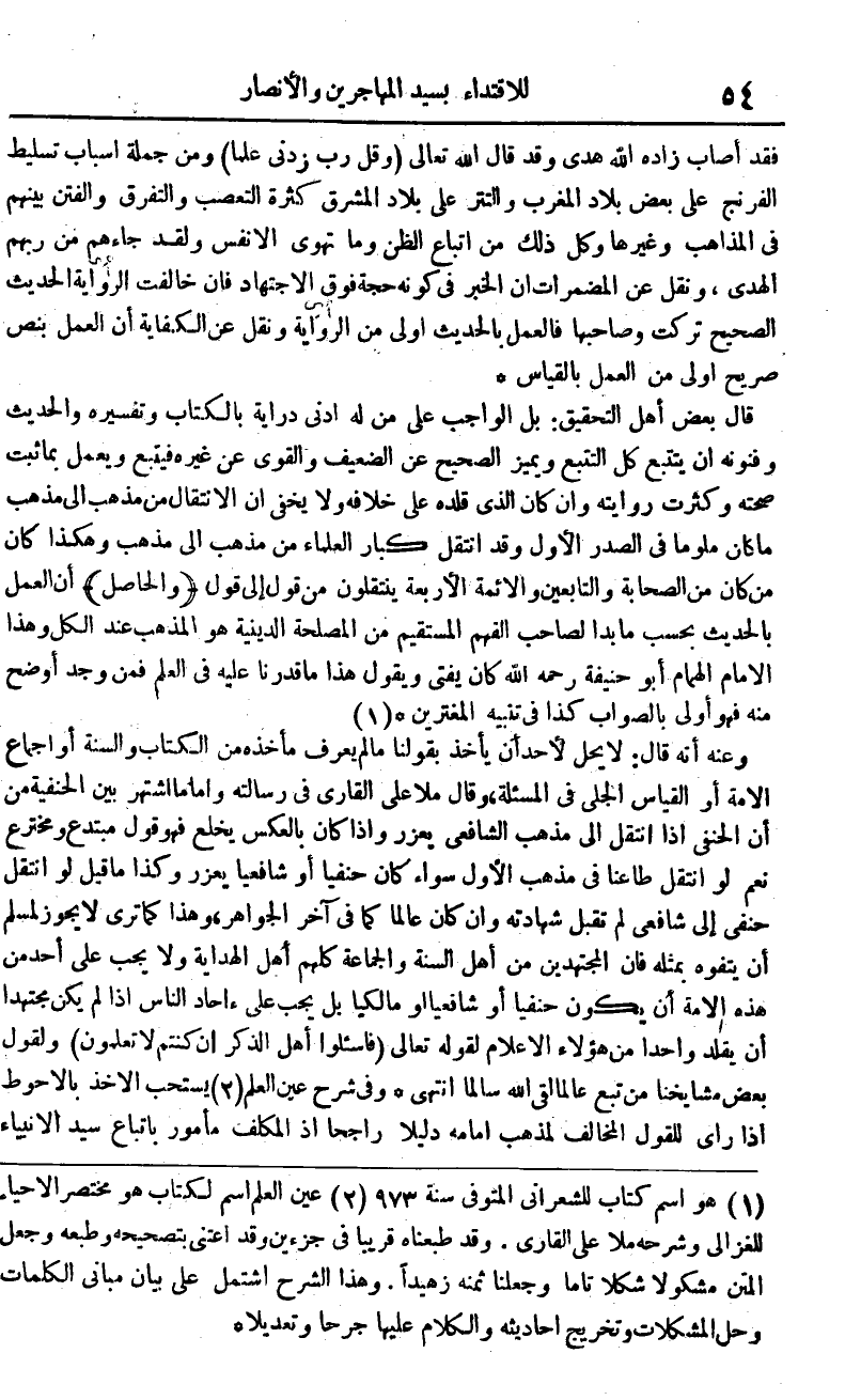 وَعنهُ أَنه قَالَ لَا يحل لأحد أَن يَأْخُذ بقولنَا مالم يعرف مأخذه من الْكتاب وَالسّنة أَو إِجْمَاع الْأمة أَو الْقيَاس الْجَلِيّ فِي الْمَسْأَلَة وَقَالَ ملا عَليّ الْقَارِي فِي رسَالَته وَأما مَا اشْتهر بَين الْحَنَفِيَّة من أَن الْحَنَفِيّ إِذا انْتقل إِلَى مَذْهَب الشَّافِعِي يُعَزّر وَإِذا كَانَ بِالْعَكْسِ يخلع فَهُوَ قَول مُبْتَدع ومخترع نعم لَو انْتقل طاعنا فِي مَذْهَب الأول سَوَاء كَانَ حنفيا أَو شافعيا يُعَزّر وَكَذَا مَا قيل لَو انْتقل حَنَفِيّ إِلَى شَافِعِيّ لم تقبل شَهَادَته وَإِن كَانَ عَالما كَمَا فِي آخر الْجَوَاهِر وَهَذَا كَمَا ترى لَا يجوز لمُسلم أَن يتفوه بِمثلِهِ فَإِن الْمُجْتَهدين من أهل السّنة وَالْجَمَاعَة كلهم أهل الْهِدَايَة وَلَا يجب على أحد من هَذِه الْأمة أَن يكون حَنِيفا أَو شافعيا أَو مالكيا بل يجب على آحَاد النَّاس إِذا لم يكن مُجْتَهدا أَن يُقَلّد وَاحِدًا من هَؤُلَاءِ الْأَعْلَام لقَوْله تَعَالَى {فاسألوا أهل الذّكر إِن كُنْتُم لَا تعلمُونَ} وَلقَوْل بعض مَشَايِخنَا من تبع عَالما لَقِي الله سالما انْتهى وَفِي شرح عين الْعلم يسْتَحبّ الْأَخْذ بالأحوط إِذا رأى لِلْقَوْلِ الْمُخَالف لمَذْهَب إِمَامه دَلِيلا راجحا إِذْ الْمُكَلف مَأْمُور بِاتِّبَاع سيد الْأَنْبِيَاء