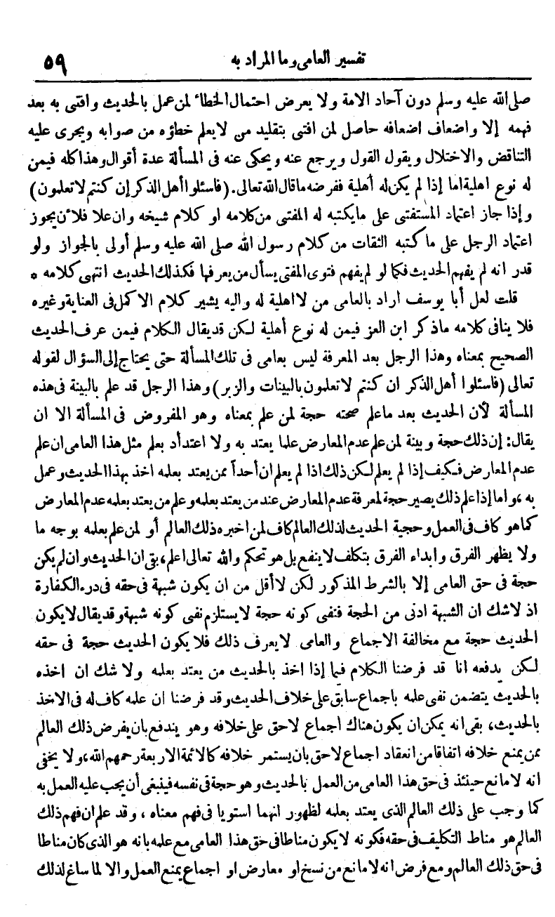 قلت لَعَلَّ أَبَا يُوسُف أَرَادَ بالعامي من لَا أَهْلِيَّة لَهُ وَإِلَيْهِ يُشِير كَلَام الْأَكْمَل فِي الْعِنَايَة وَغَيره فَلَا يُنَافِي كَلَامه مَا ذكر ابْن الْعِزّ فِيمَن لَهُ نوع أَهْلِيَّة لَكِن قد يُقَال الْكَلَام فِيمَن عرف الحَدِيث الصَّحِيح بِمَعْنَاهُ وَهَذَا الرجل بعد الْمعرفَة لَيْسَ بعامي فِي تِلْكَ الْمَسْأَلَة حَتَّى يحْتَاج إِلَى السُّؤَال لقَوْله تَعَالَى {فاسألوا أهل الذّكر إِن كُنْتُم لَا تعلمُونَ بِالْبَيِّنَاتِ والزبر} وَهَذَا الرجل قد علم بِالْبَيِّنَةِ فِي هَذِه الْمَسْأَلَة لِأَن الحَدِيث بعد مَا علم صِحَّته حجَّة لمن علم بِمَعْنَاهُ وَهُوَ الْمَفْرُوض فِي الْمَسْأَلَة إِلَّا أَن يُقَال إِن ذَلِك حجَّة وَبَيِّنَة لمن علم عدم الْمعَارض علما يعْتد بِهِ وَلَا اعْتِدَاد بِعلم مثل هَذَا الْعَاميّ إِن علم عدم الْمعَارض فَكيف إِذا لم يعلم لَكِن ذَلِك إِذا لم يعلم أَن أحدا مِمَّن يعْتد بِعِلْمِهِ أَخذ بِهَذَا الحَدِيث وَعمل بِهِ وَأما إِذا علم ذَلِك يصير حجَّة لمعْرِفَة عدم الْمعَارض عِنْد من يعْتد بِعِلْمِهِ وَعلم من يعْتد بِعِلْمِهِ عدم الْمعَارض كَمَا هُوَ كَاف فِي الْعَمَل وحجية الحَدِيث لذَلِك الْعَالم كَاف لمن أخبرهُ ذَلِك الْعَالم أَو لمن علم بِعِلْمِهِ بِوَجْه مَا وَلَا يظْهر الْفرق وإبداء الْفرق يتَكَلَّف لَا ينفع بل هُوَ تحكم وَالله تَعَالَى أعلم بَقِي أَن الحَدِيث وَإِن لم يكن حجَّة فِي حق الْعَاميّ إِلَّا بِالشّرطِ الْمَذْكُور لَكِن لَا أقل من أَن يكون شُبْهَة فِي حَقه فِي دَرْء الْكَفَّارَة إِذْ لَا شكّ أَن الشُّبْهَة أدنى من الْحجَّة فنفي كَونه حجَّة لَا يسْتَلْزم نفي كَونه شُبْهَة وَقد يُقَال لَا يكون الحَدِيث حجَّة مَعَ مُخَالفَة الْإِجْمَاع والعامي لَا يعرف ذَلِك فَلَا يكون الحَدِيث حجَّة فِي حَقه لَكِن يَدْفَعهُ أَنا قد فَرضنَا الْكَلَام فِيمَا إِذا أَخذ بِالْحَدِيثِ من يعْتد بِعِلْمِهِ وَلَا شكّ أَن أَخذه بِالْحَدِيثِ يتَضَمَّن نفي علمه بِإِجْمَاع سَابق على خلاف الحَدِيث وَقد فَرضنَا أَن علمه كَاف لَهُ فِي الْأَخْذ بِالْحَدِيثِ بَقِي أَنه يُمكن أَن يكون هُنَاكَ إِجْمَاع لَاحق على خِلَافه وَهُوَ ينْدَفع بِأَن يفْرض ذَلِك الْعَالم مِمَّن يمْنَع خِلَافه اتِّفَاقًا من انْعِقَاد إِجْمَاع لَاحق بِأَن يسْتَمر خِلَافه كالأئمة الْأَرْبَعَة رَحِمهم الله وَلَا يخفى أَنه لَا مَانع حِينَئِذٍ فِي حق هَذَا الْعَاميّ من الْعَمَل بِالْحَدِيثِ وَهُوَ حجَّة فِي نَفسه فَيَنْبَغِي أَن يجب عَلَيْهِ الْعَمَل بِهِ كَمَا وَجب على ذَلِك الْعَالم الَّذِي يعْتد بِعِلْمِهِ لظُهُور أَنَّهُمَا اسْتَويَا فِي فهم مَعْنَاهُ وَقد علم أَن فهم ذَلِك الْعَالم هُوَ منَاط التَّكْلِيف فِي حَقه فكونه لَا يكون مناطا فِي حق هَذَا الْعَاميّ مَعَ علمه بِأَنَّهُ هُوَ الَّذِي كَانَ مناطا فِي حق ذَلِك الْعَالم وَمَعَ فرض أَنه لَا مَانع من نسخ أَو معَارض أَو إِجْمَاع يمْنَع الْعَمَل وَإِلَّا لما سَاغَ لذَلِك