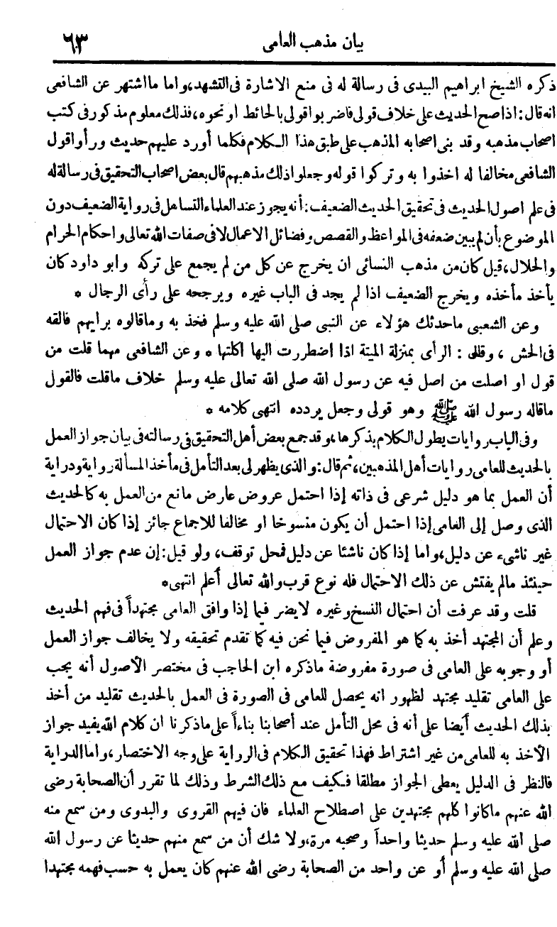 وَفِي الْبَاب رِوَايَات يطول الْكَلَام بذكرها وَقد جمع بعض أهل التَّحْقِيق فِي رسَالَته فِي بَيَان جَوَاز الْعَمَل بِالْحَدِيثِ للعامي رِوَايَات أهل المذهبين ثمَّ قَالَ وَالَّذِي يظْهر لي بعد التَّأَمُّل فِي مَأْخَذ الْمَسْأَلَة رِوَايَة ودراية أَن الْعَمَل بِمَا هُوَ دَلِيل شَرْعِي فِي ذَاته إِذا احْتمل عرُوض عَارض مَانع من الْعَمَل بِهِ كالحديث الَّذِي وصل إِلَى الْعَاميّ إِذا احْتمل أَن يكون مَنْسُوخا أَو مُخَالفا للْإِجْمَاع جَائِز إِذا كَانَ الِاحْتِمَال غير نَاشِئ عَن دَلِيل وَأما إِذا كَانَ ناشئا عَن دَلِيل فَمحل توقف وَلَو قيل إِن عدم جَوَاز الْعَمَل حِينَئِذٍ مَا لم يفتش عَن ذَلِك الِاحْتِمَال فَلهُ نوع قرب وَالله تَعَالَى أعلم انْتهى