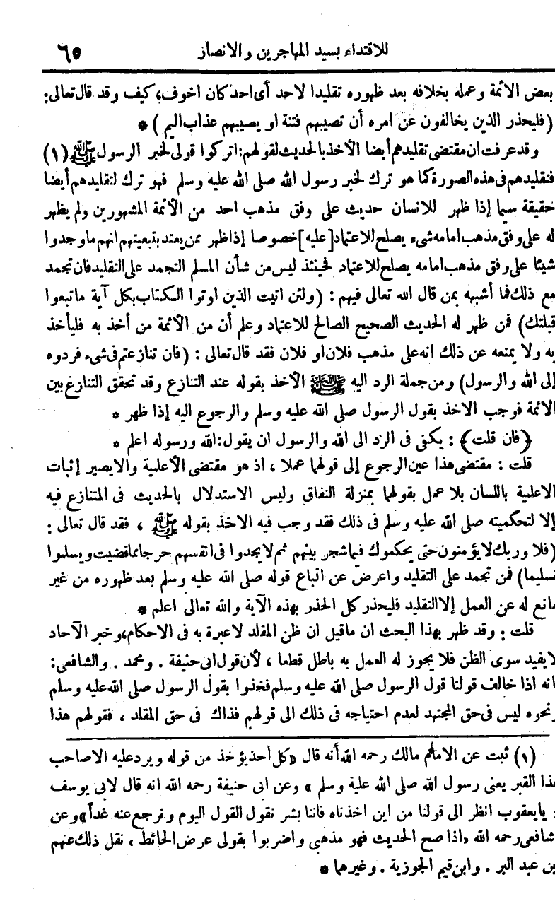 قلت مُقْتَضى هَذَا عين الرُّجُوع إِلَى قَوْلهمَا عملا إِذْ هُوَ مُقْتَضى الأعلمية وَألا يصير إِثْبَات الأعلمية بِاللِّسَانِ بِلَا عمل بقولهمَا بِمَنْزِلَة النِّفَاق وَلَيْسَ الِاسْتِدْلَال بِالْحَدِيثِ فِي الْمُتَنَازع فِيهِ إِلَّا لتحكميته صلى الله عَلَيْهِ وَسلم فِي ذَلِك فقد وَجب فِيهِ الْأَخْذ بقوله صلى الله عَلَيْهِ وَسلم فقد قَالَ تَعَالَى {فَلَا وَرَبك لَا يُؤمنُونَ حَتَّى يُحَكِّمُوك فِيمَا شجر بَينهم ثمَّ لَا يَجدوا فِي أنفسهم حرجا مِمَّا قضيت ويسلموا تَسْلِيمًا} فَمن تجمد على التَّقْلِيد وَأعْرض عَن اتِّبَاع قَوْله صلى الله عَلَيْهِ وَسلم بعد ظُهُوره من غير مَانع لَهُ عَن الْعَمَل إِلَّا التَّقْلِيد فليحذر كل الحذر بِهَذِهِ الْآيَة وَالله تَعَالَى أعلم