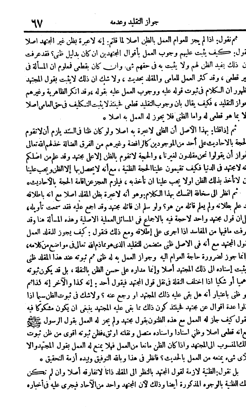 ثمَّ نقُول اذا لم يجز للعوام الْعَمَل بِالظَّنِّ أصلا لما قُلْتُمْ إِنَّه لَا عِبْرَة بِظَنّ غير الْمُجْتَهد أصلا نقُول كَيفَ يثبت عَلَيْهِم وجوب الْعَمَل بأقوال الْمُجْتَهدين ان كَانَ بِدَلِيل ظَنِّي فقد عرفت ان ذَلِك يُفِيد الظَّن لَهُم وَلَا يثبت بِهِ فِي حَقهم شَيْء وان كَانَ بقطعي فمعلوم أَن الْمَسْأَلَة فِي غير قَطْعِيّ وَقد كثر الْعَمَل للعامي والمقلد بِحَدِيث وَلَا شكّ أَن ذَلِك لَا يثبت بقول الْمُجْتَهد لظُهُور أَن الْكَلَام فِي ثُبُوت قَوْله عَلَيْهِ وَوُجُوب الْعَمَل عَلَيْهِ بقوله وَقد أنكر الظَّاهِرِيَّة وَغَيرهم جَوَاز التَّقْلِيد فَكيف يُقَال بِأَن وجوب التَّقْلِيد قَطْعِيّ فَحِينَئِذٍ لَا يثبت التَّكْلِيف فِي حق الْعَاميّ أصلا الا بِمَا هُوَ قَطْعِيّ لَهُ وَأما الظني فَلَا يجوز لَهُ الْعَمَل بِهِ أصلا