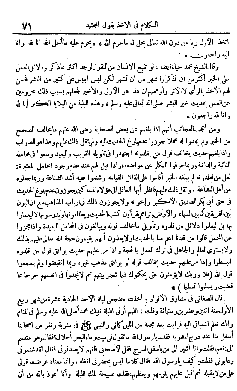 وَقَالَ الشَّيْخ مُحَمَّد حَيَاة ايضا لَو تتبع الانسان من النقول لوجد أَكثر مِمَّا ذكر وَدَلَائِل الْعَمَل على الْخَيْر اكثر من أَن تذكر وَأشهر من أَن تشهر لَكِن لبس ابليس على كثير من الْبشر فَحسن لَهُم الْأَخْذ بِالرَّأْيِ لَا الْأَثر وأوهمهم أَن هَذَا هُوَ الأولى والأخير فجعلهم بِسَبَب ذَلِك محرومين عَن الْعَمَل بِحَدِيث خير الْبشر صلى الله تَعَالَى عَلَيْهِ وَسلم وَهَذِه البلية من البلايا الْكبر إِنَّا لله وَإِنَّا لله رَاجِعُون