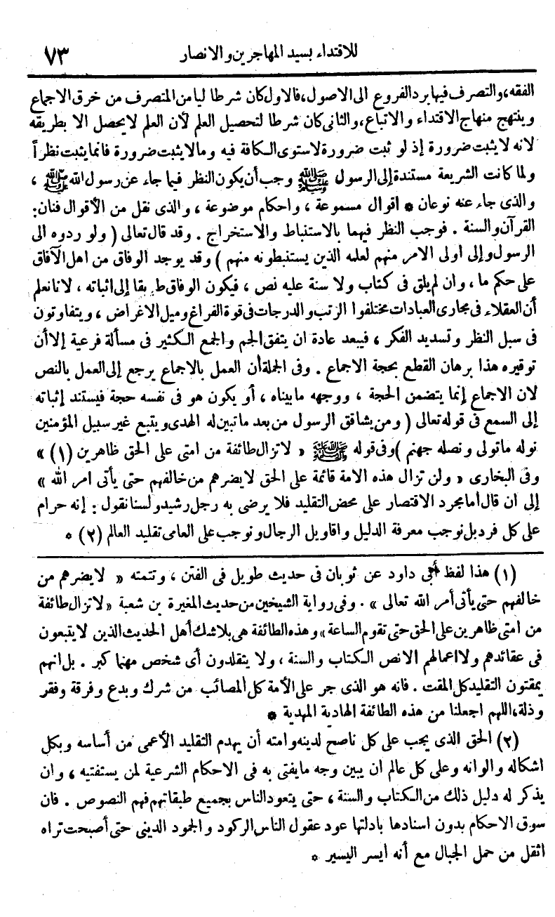 الْفِقْه وَالتَّصَرُّف فِيهَا برد الْفُرُوع إِلَى الْأُصُول فَالْأول كَانَ شرطا ليأمن الْمُتَصَرف من خرق الْإِجْمَاع وينتهج منهاج الِاقْتِدَاء والاتباع وَالثَّانِي كَانَ شرطا لتَحْصِيل الْعلم لِأَن الْعلم لَا يحصل إِلَّا بطريقة لِأَنَّهُ لَا يثبت ضَرُورَة إِذْ لَو ثَبت ضَرُورَة لاستوى الكافة فِيهِ ومالا يثبت ضَرُورَة فَإِنَّمَا يثبت نظرا وَلما كَانَت الشَّرِيعَة مستندة إِلَى الرَّسُول صلى الله عَلَيْهِ وَسلم وَجب أَن يكون النّظر فِيمَا جَاءَ عَن رَسُول الله صلى الله عَلَيْهِ وَسلم وَالَّذِي جَاءَ عَنهُ نَوْعَانِ أَقْوَال مسموعة وَأَحْكَام مَوْضُوعَة وَالَّذِي نقل من الْأَقْوَال فنان الْقُرْآن وَالسّنة فَوَجَبَ النّظر فيهمَا بالاستنباط والاستخراج وَقد قَالَ تَعَالَى {وَلَو ردُّوهُ إِلَى الرَّسُول وَإِلَى أولي الْأَمر مِنْهُم لعلمه الَّذين يستنبطونه مِنْهُم} وَقد يُوجد الْوِفَاق من أهل الْآفَاق على حكم مَا وَإِن لم يلق فِي كتاب وَلَا سنة عَلَيْهِ نَص فَيكون الْوِفَاق طَرِيقا إِلَى إثْبَاته لأَنا نعلم أَن الْعُقَلَاء فِي مجاري الْعِبَادَات مختلفو الرتب والدرجات فِي قُوَّة الْفَرَاغ وميل الْأَغْرَاض ويتفاوتون فِي سبل النّظر وتسديد الْفِكر فيبعد عَادَة أَن يتَّفق الجم وَالْجمع الْكثير فِي مَسْأَلَة فرعية إِلَّا أَن توقيره هَذَا برهَان الْقطع بِحجَّة الْإِجْمَاع وَفِي الْجُمْلَة أَن الْعَمَل بِالْإِجْمَاع يرجع إِلَى الْعَمَل بِالنَّصِّ لِأَن الْإِجْمَاع إِنَّمَا يتَضَمَّن الْحجَّة وَوَجهه مَا بَيناهُ أَو يكون هُوَ فِي نَفسه حجَّة فيستند إثْبَاته إِلَى السّمع فِي قَوْله تَعَالَى {وَمن يُشَاقق الرَّسُول من بعد مَا تبين لَهُ الْهدى وَيتبع غير سَبِيل الْمُؤمنِينَ نوله مَا تولى ونصله جَهَنَّم} وَفِي قَوْله صلى الله عَلَيْهِ وَسلم لَا تزَال طَائِفَة من أمتِي على الْحق ظَاهِرين وَفِي البُخَارِيّ وَلنْ تزَال هَذِه الْأمة قَائِمَة على الْحق لَا يضرهم من خالفهم حَتَّى يَأْتِي أَمر الله إِلَى أَن قَالَ أما مُجَرّد الِاقْتِصَار على مَحْض التَّقْلِيد فَلَا يرضى بِهِ رجل رشيد ولسنا نقُول إِنَّه حرَام على كل فَرد بل نوجب معرفَة الدَّلِيل وأقاويل الرِّجَال ونوجب على الْعَاميّ تَقْلِيد الْعَالم