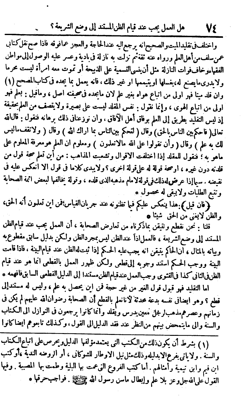 قُلْنَا نَحن نقطع ونتيقن بِمَا ذَكرْنَاهُ من تعَارض الصَّحَابَة أَن الْعَمَل يجب عِنْد قيام الظَّن الْمُسْتَند إِلَى وضع الشَّرِيعَة فَالْعَمَل إِذا عِنْد الظَّن لَيْسَ بِمُجَرَّد الظَّن وَلَكِن بِدَلِيل سَابق مَقْطُوع بِهِ وَبَيَانه بالمثال أَن الْحَاكِم يتَيَقَّن أَنه يجب عَلَيْهِ الحكم إِذا ثَبت لَهُ الظَّن عِنْد قيام الْبَيِّنَة فَإِذا قَامَت الْبَيِّنَة وَوَجَب الحكم اسْتندَ وُجُوبه إِلَى قَطْعِيّ وَلَكِن ظُهُور الْعَمَل بالقطعي إِنَّمَا هُوَ عِنْد قيام الظَّن فِي الثَّانِي كَذَا فِي الْفَتْوَى وَجب الْعَمَل عِنْد قيام الظَّن مُسْتَندا إِلَى الدَّلِيل الْقطعِي السَّابِق فافهمه