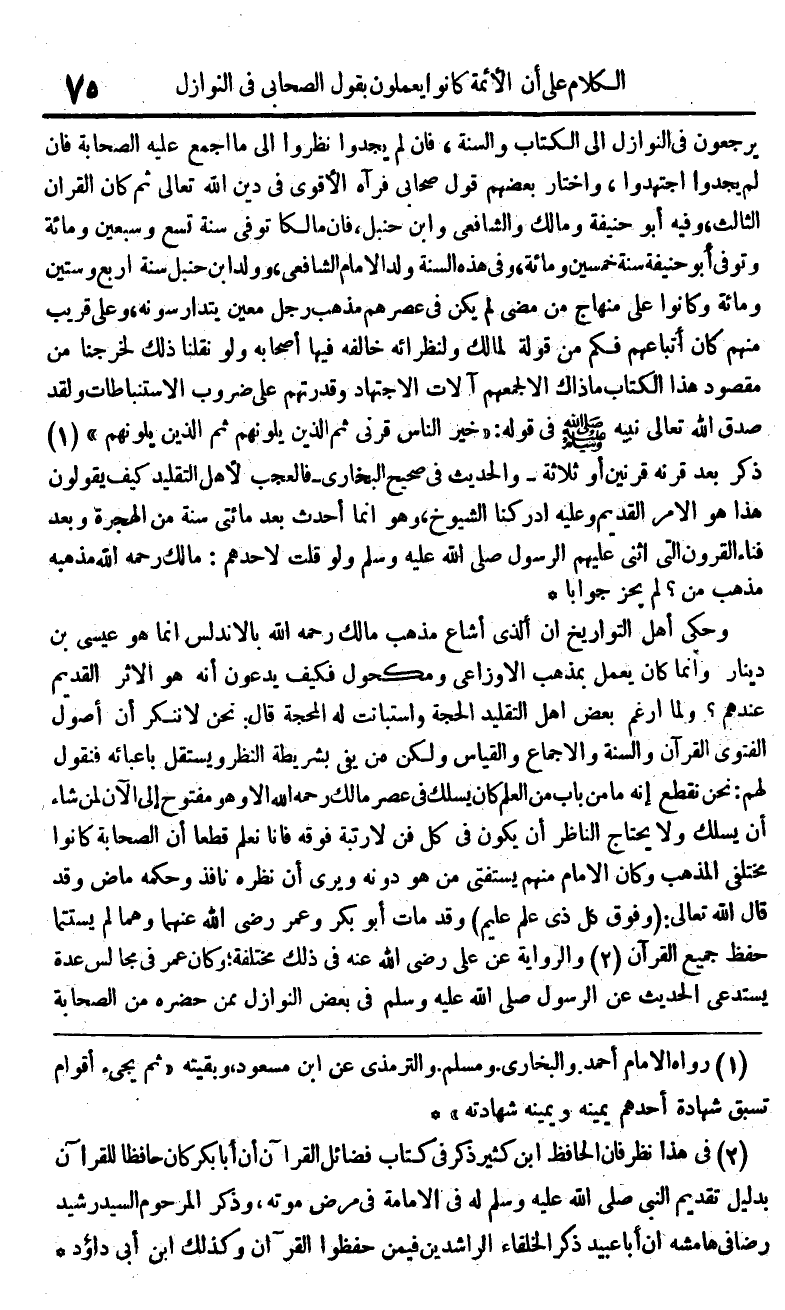 يرجعُونَ فِي النَّوَازِل إِلَى الْكتاب وَالسّنة فَإِن لم يَجدوا نظرُوا إِلَى مَا أجمع عَلَيْهِ الصَّحَابَة فَإِن لم يَجدوا اجتهدوا وَاخْتَارَ بَعضهم قَول صَحَابِيّ فَرَآهُ الْأَقْوَى فِي دين الله تَعَالَى ثمَّ كَانَ الْقُرْآن الثَّالِث وَفِيه أَبُو حنيفَة وَمَالك وَالشَّافِعِيّ وَابْن حَنْبَل فَإِن مَالِكًا توفّي سنة تسع وَسبعين وَمِائَة وَتُوفِّي أَبُو حنيفَة سنة خمسين وَمِائَة وَفِي هَذِه السّنة ولد الإِمَام الشَّافِعِي وَولد ابْن حَنْبَل سنة أَربع وَسِتِّينَ وَمِائَة وَكَانُوا على منهاج من مضى لم يكن فِي عصرهم مَذْهَب رجل معِين يتدارسونه وعَلى قريب مِنْهُم كَانَ أتباعهم فكم من قولة لمَالِك ولنظرائه خَالفه فِيهَا أَصْحَابه وَلَو نقلنا ذَلِك لخرجنا من مَقْصُود هَذَا الْكتاب مَا ذَاك إِلَّا لجمعهم آلَات الِاجْتِهَاد وقدرتهم على ضروب الاستنباطات وَلَقَد صدق الله تَعَالَى نبيه ص فِي قَوْله خير النَّاس قَرْني ثمَّ الَّذين يَلُونَهُمْ ثمَّ الَّذين يَلُونَهُمْ ذكر بعد قرنه قرنين أَو ثَلَاثَة والْحَدِيث فِي صَحِيح البُخَارِيّ فالعجب لأهل التَّقْلِيد كَيفَ يَقُولُونَ هَذَا هُوَ الْأَمر الْقَدِيم وَعَلِيهِ أدركنا الشُّيُوخ وَهُوَ إِنَّمَا أحدث بعد مِائَتي سنة من الْهِجْرَة وَبعد فنَاء الْقُرُون الَّتِي أثنى عَلَيْهِم الرَّسُول صلى الله عَلَيْهِ وَسلم وَلَو قلت لأَحَدهم مَالك رَحمَه الله مذْهبه مَذْهَب من لم يحز جَوَابا