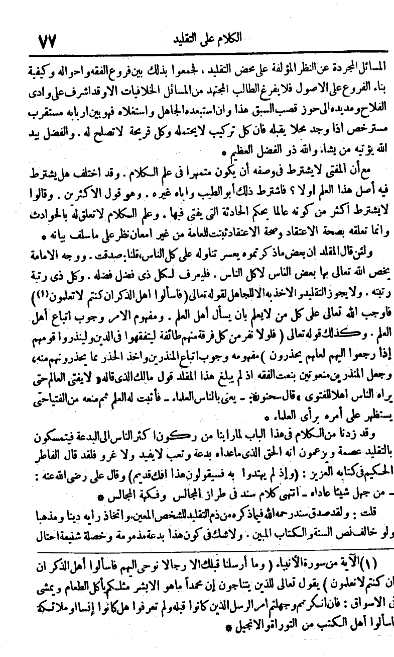 وَلَئِن قَالَ الْمُقَلّد إِن بعض مَا ذكرتموه يعسر تنَاوله على كل النَّاس قُلْنَا صدقت وَوجه الْإِمَامَة يخص الله تَعَالَى بهَا بعض النَّاس لَا كل النَّاس فليعرف لكل ذِي فضل فَضله وكل ذِي رُتْبَة رتبته وَلَا يجوز التَّقْلِيد وَالْأَخْذ بِهِ إِلَّا للجاهل لقَوْله تَعَالَى {فاسألوا أهل الذّكر إِن كُنْتُم لَا تعلمُونَ} فَأوجب الله تَعَالَى على كل من لَا يعلم بِأَن يسْأَل اهل الْعلم وَمَفْهُوم الْأَمر وجوب اتِّبَاع أهل الْعلم وَكَذَلِكَ قَوْله تَعَالَى {فلولا نفر من كل فرقة مِنْهُم طَائِفَة ليتفقهوا فِي الدّين ولينذروا قَومهمْ إِذا رجعُوا إِلَيْهِم لَعَلَّهُم يحذرون} مَفْهُومه وجوب اتِّبَاع الْمُنْذرين وَأخذ الحذر مِمَّا يحذرونهم مِنْهُ وَجعل الْمُنْذرين منعوتين بنعت الْفِقْه إِذْ لم يبلغ هَذَا الْمُقَلّد قَول مَالك الَّذِي قَالَه لَا يُفْتِي الْعَالم حَتَّى يرَاهُ النَّاس أَهلا للْفَتْوَى قَالَ سَحْنُون يَعْنِي بِالنَّاسِ الْعلمَاء فَأثْبت لَهُ الْعلم ثمَّ مَنعه من الْفتيا حَتَّى يستظهر على أمره بِرَأْي الْعلمَاء