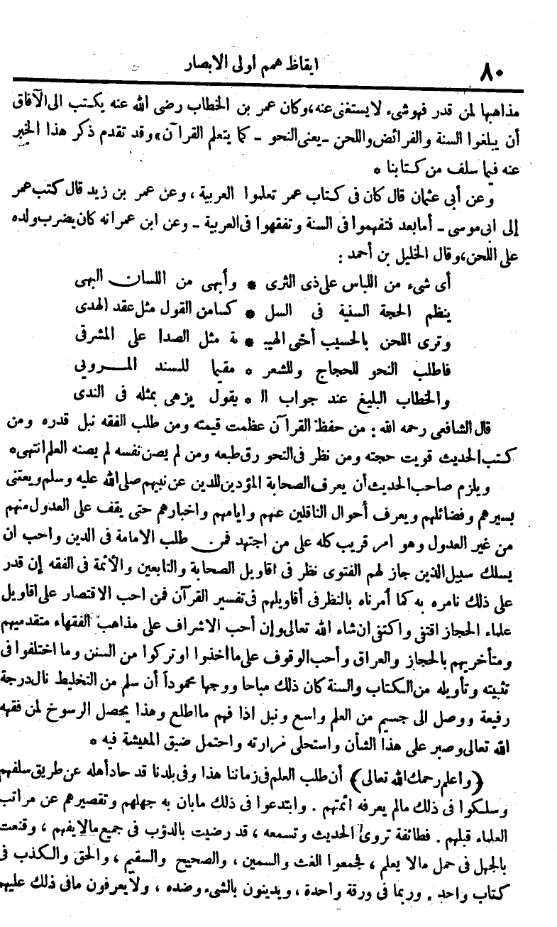 وَعَن أبي عُثْمَان قَالَ كَانَ فِي كتاب عمر تعلمُوا الْعَرَبيَّة وَعَن عمر بن زيد قَالَ كتب عمر إِلَى أبي مُوسَى أما بعد فتفهموا فِي السّنة وتفقهوا فِي الْعَرَبيَّة وَعَن ابْن عمر أَنه كَانَ يضْرب وَلَده على اللّحن وَقَالَ الْخَلِيل بن أَحْمد ... أَي شَيْء من اللبَاس على ذِي الثرى ... وأبهى من اللِّسَان الْبَهِي