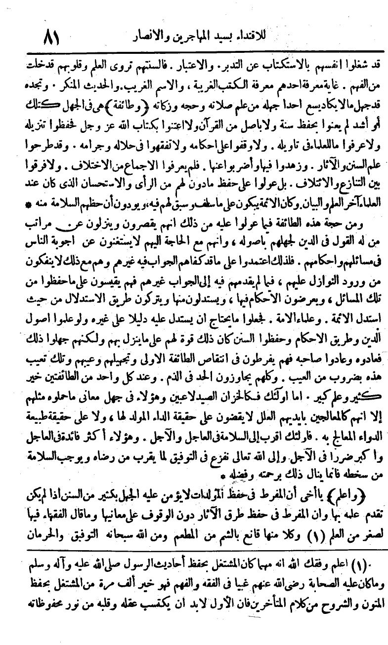 وَاعْلَم يَا أخي أَن المفرط فِي حفظ المولدات لَا يُؤمن عَلَيْهِ الْجَهْل بِكَثِير من السّنَن إِذا لم يكن تقدم علمه بهَا وَأَن المفرط فِي حفظ طرق الْآثَار دون الْوُقُوف على مَعَانِيهَا وَمَا قَالَ الْفُقَهَاء فِيهَا لصِغَر من الْعلم وكلا مِنْهَا قَانِع بالشم من الْمطعم وَمن الله سُبْحَانَهُ التَّوْفِيق والحرمان
