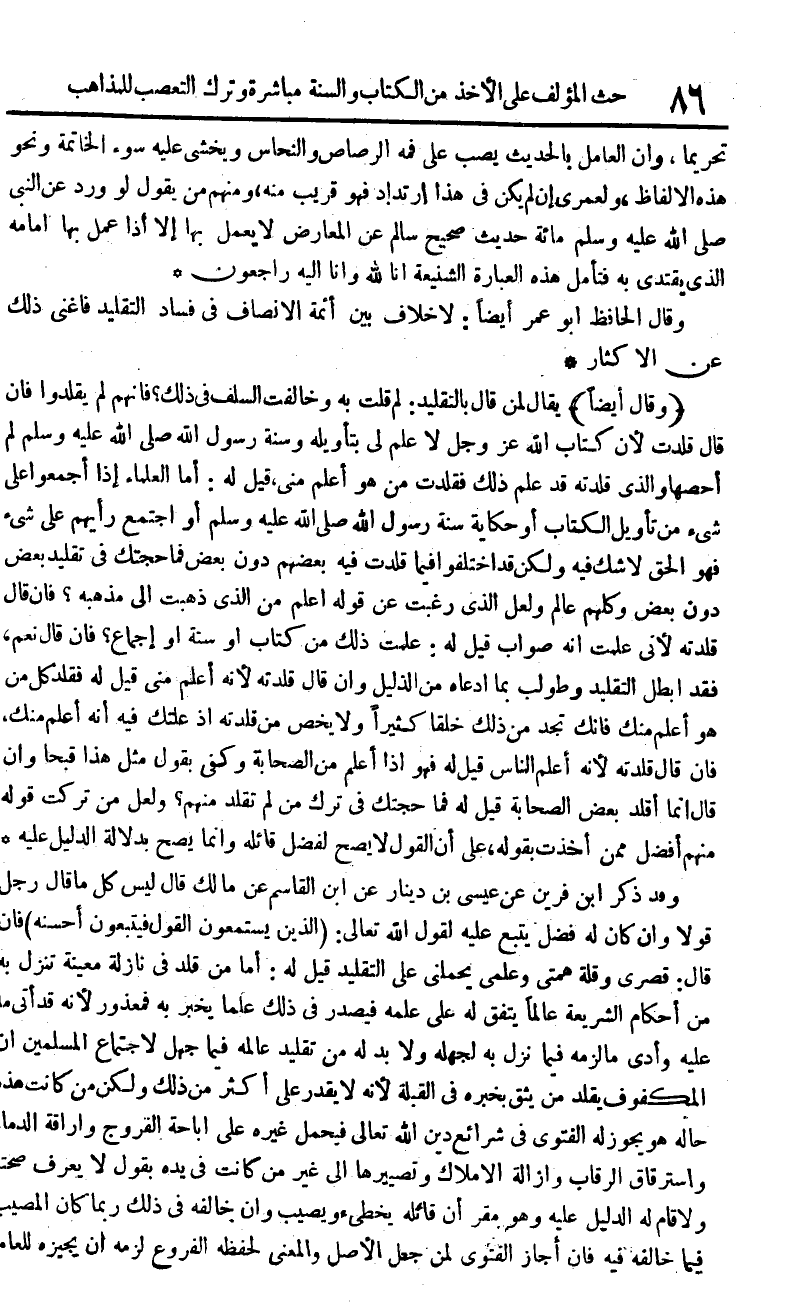 تَحْرِيمًا وَأَن الْعَامِل بِالْحَدِيثِ يصب على فَمه الرصاص والنحاس ويخشى عَلَيْهِ سوء الخاتمة وَنَحْو هَذِه الالفاظ ولعمري إِن لم يكن فِي هَذَا ارتداد فَهُوَ قريب مِنْهُ وَمِنْهُم من يَقُول لَو ورد عَن النَّبِي صلى الله عَلَيْهِ وَسلم مائَة حَدِيث صَحِيح سَالم عَن الْمعَارض لَا يعْمل بهَا إِلَّا إِذا عمل بهَا إِمَامه الَّذِي يَقْتَدِي بِهِ فَتَأمل هَذِه الْعبارَة الشنيعة إِنَّا لله وَإِنَّا إِلَيْهِ رَاجِعُون