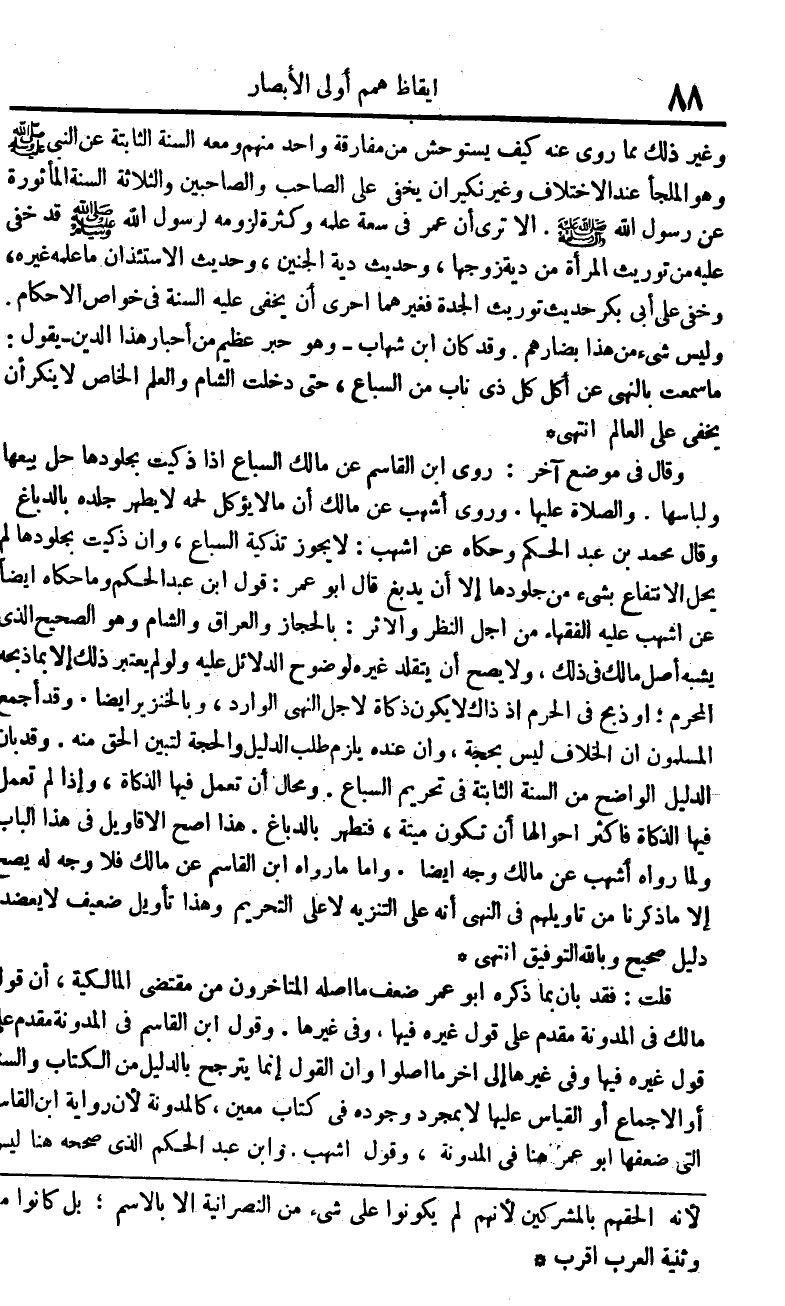 وَغير ذَلِك مَا من روى عَنهُ كَيفَ يستوحش من مُفَارقَة وَاحِد مِنْهُم وَمَعَهُ السّنة الثَّابِتَة عَن النَّبِي صلى الله عَلَيْهِ وَسلم وَهُوَ الملجأ عِنْد الِاخْتِلَاف وَغير نَكِير أَن يخفى على الصاحب والصاحبين وَالثَّلَاثَة السّنة المأثورة عَن رَسُول الله صلى الله عَلَيْهِ وَسلم أَلا ترى أَن عمر فِي سَعَة علمه وَكَثْرَة لُزُومه لرَسُول الله صلى الله عَلَيْهِ وَسلم قد خَفِي عَلَيْهِ من تَوْرِيث الْمَرْأَة من دِيَة زَوجهَا وَحَدِيث دِيَة الْجَنِين وَحَدِيث الاسْتِئْذَان مَا علمه غَيره وخفي على ابي بكر حَدِيث تَوْرِيث الْجدّة فغيرهما أَحْرَى أَن يخفى عَلَيْهِ السّنة فِي خَواص الْأَحْكَام وَلَيْسَ شَيْء من هَذَا بضارهم وَقد كَانَ ابْن شهَاب وَهُوَ حبر عَظِيم من أَحْبَار هَذَا الدّين يَقُول مَا سَمِعت بِالنَّهْي عَن أكل كل ذِي نَاب من السبَاع حَتَّى دخلت الشَّام وَالْعلم الْخَاص لَا يُنكر أَن يخفى على الْعَالم انْتهى