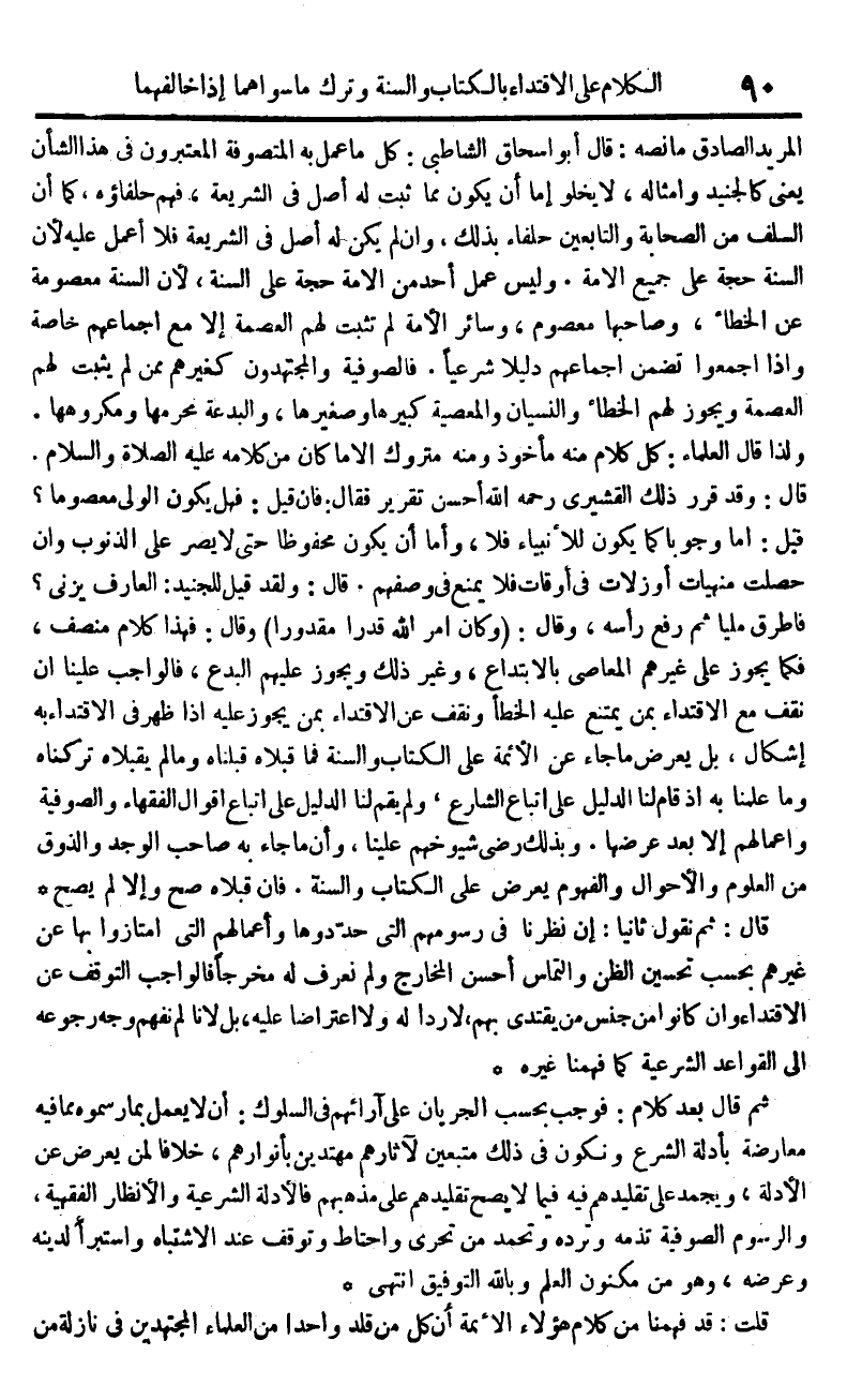المريد الصَّادِق مَا نَصه قَالَ أَبُو إِسْحَاق الشاطبي كل مَا عمل بِهِ المتصوفة المعتبرون فِي هَذَا الشَّأْن يَعْنِي كالجنيد وَأَمْثَاله لَا يَخْلُو إِمَّا أَن يكون مِمَّا ثَبت لَهُ أصل فِي الشَّرِيعَة فهم حلفاؤه كَمَا أَن السّلف من الصَّحَابَة وَالتَّابِعِينَ حلفاء بذلك وَإِن لم يكن لَهُ أصل فِي الشَّرِيعَة فَلَا أعمل عَلَيْهِ لِأَن السّنة حجَّة على جَمِيع الْأمة وَلَيْسَ عمل أحد من الْأمة حجَّة على السّنة لِأَن السّنة معصومة عَن الْخَطَأ وصاحبها مَعْصُوم وَسَائِر الْأمة لم تثبت لَهُم الْعِصْمَة إِلَّا مَعَ إِجْمَاعهم خَاصَّة وَإِذا أَجمعُوا تضمن إِجْمَاعهم دَلِيلا شَرْعِيًّا فالصوفية والمجتهدون كغيرهم مِمَّن لم يثبت لَهُم الْعِصْمَة وَيجوز لَهُم الْخَطَأ وَالنِّسْيَان وَالْمَعْصِيَة كبيرها وصغيرها والبدعة محرمها ومكروهها وَلذَا قَالَ الْعلمَاء كل كَلَام مِنْهُ مَأْخُوذ وَمِنْه مَتْرُوك إِلَّا مَا كَانَ من كَلَامه عَلَيْهِ الصَّلَاة وَالسَّلَام قَالَ وَقد قرر ذَلِك الْقشيرِي رَحمَه الله أحسن تَقْرِير فَقَالَ فَإِن قيل فَهَل يكون الْوَلِيّ مَعْصُوما قيل أما وجوبا كَمَا يكون للأنبياء فَلَا وَأما أَن يكون مَحْفُوظًا حَتَّى لَا يصر على الذُّنُوب وَإِن حصلت منهيات أَو زلات فِي أَوْقَات فَلَا يمْنَع فِي وَصفهم قَالَ وَلَقَد قيل للجنيد الْعَارِف يَزْنِي فَأَطْرَقَ مَلِيًّا ثمَّ رفع رَأسه وَقَالَ {وَكَانَ أَمر الله قدرا مَقْدُورًا} وَقَالَ فَهَذَا كَلَام منصف فَكَمَا يجوز على غَيرهم الْمعاصِي بالابتداع وَغير ذَلِك وَيجوز عَلَيْهِم الْبدع فَالْوَاجِب علينا أَن نقف مَعَ الِاقْتِدَاء بِمن يمْتَنع عَلَيْهِ الْخَطَأ ونقف عَن الِاقْتِدَاء بِمن يجوز عَلَيْهِ إِذا ظهر فِي الِاقْتِدَاء بِهِ إِشْكَال بل يعرض مَا جَاءَ عَن الْأَئِمَّة على الْكتاب وَالسّنة فَمَا قبلاه قبلناه ومالم يقبلاه تَرَكْنَاهُ وَمَا علمنَا بِهِ إِذا قَامَ لنا الدَّلِيل على اتِّبَاع الشَّارِع وَلم يقم لنا الدَّلِيل على اتِّبَاع أَقْوَال الْفُقَهَاء والصوفية وأعمالهم إِلَّا بعد عرضهَا وَبِذَلِك رَضِي شيوخهم علينا وَأَن مَا جَاءَ بِهِ صَاحب الوجد والذوق من الْعُلُوم وَالْأَحْوَال والفهوم يعرض على الْكتاب وَالسّنة فَإِن قبلاه صَحَّ وَإِلَّا لم يَصح
