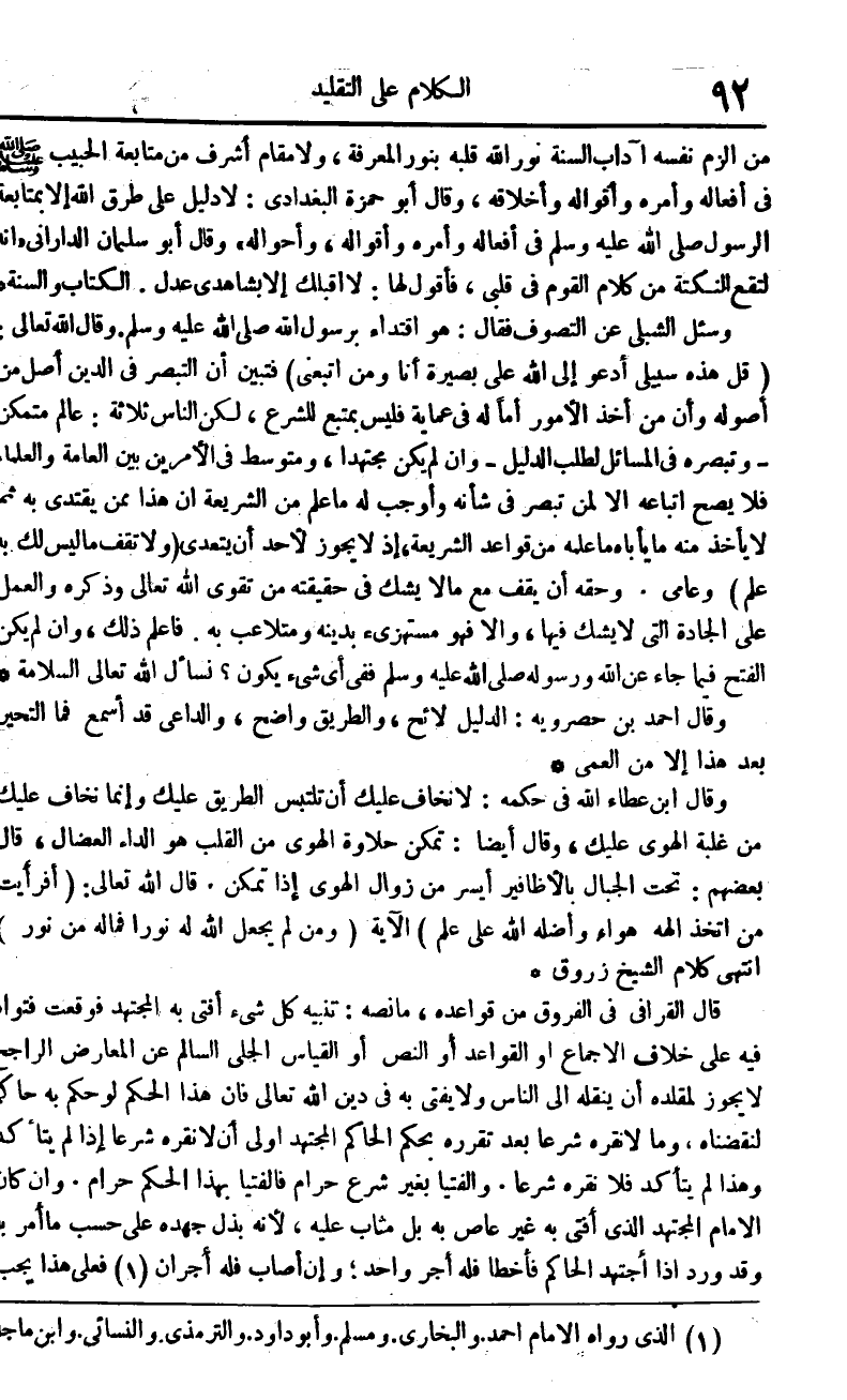 وَسُئِلَ الشبلي عَن التصوف فَقَالَ هُوَ اقْتِدَاء برَسُول الله صلى الله عَلَيْهِ وَسلم وَقَالَ الله تَعَالَى {قل هَذِه سبيلي أَدْعُو إِلَى الله على بَصِيرَة أَنا وَمن اتبعني} فَتبين أَن التبصر فِي الدّين أصل من أُصُوله وَأَن من أَخذ الْأُمُور أما لَهُ فِي عماية فَلَيْسَ بمتبع للشَّرْع لَكِن النَّاس ثَلَاثَة عَالم مُتَمَكن وتبصره فِي الْمسَائِل لطلب الدَّلِيل وَإِن لم يكن مُجْتَهدا ومتوسط فِي الْأَمريْنِ بَين الْعَامَّة وَالْعُلَمَاء فَلَا يَصح أَتْبَاعه إِلَّا لمن تبصر فِي شَأْنه وَأوجب لَهُ مَا علم من الشَّرِيعَة إِن هَذَا مِمَّن يقْتَدى بِهِ ثمَّ لَا يَأْخُذ مِنْهُ مَا يأباه مَا علمه من قَوَاعِد الشَّرِيعَة إِذْ لَا يجوز لأحد أَن يتَعَدَّى {وَلَا تقف مَا لَيْسَ لَك بِهِ علم} وعامي وَحقه أَن يقف مَعَ مَالا يشك فِي حَقِيقَته من تقوى الله تَعَالَى وَذكره وَالْعَمَل على الجادة الَّتِي لَا يشك فِيهَا وَإِلَّا فَهُوَ مستهزئ بِدِينِهِ ومتلاعب بِهِ فَاعْلَم ذَلِك وَإِن لم يكن الْفَتْح فِيمَا جَاءَ عَن الله وَرَسُوله ص فَفِي أَي شَيْء يكون نسْأَل الله تَعَالَى السَّلامَة