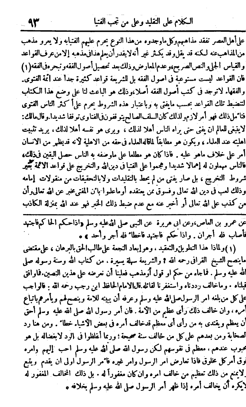 على أهل الْعَصْر تفقد مذاهبهم وكل مَا وجدوه من هَذَا النَّوْع يحرم عَلَيْهِم الْفتيا بِهِ وَلَا يعرو مَذْهَب من الْمذَاهب عَنهُ لكنه قد يقل وَقد يكثر غير أَنه لَا يقدر أَن يعلم هَذَا فِي مذْهبه إِلَّا من عرف الْقَوَاعِد وَالْقِيَاس الْجَلِيّ وَالنَّص الصَّرِيح وَعدم الْمعَارض وَذَلِكَ بعد تَحْصِيل أصُول الْفِقْه وتبحره فِي الْفِقْه فَإِن الْقَوَاعِد لَيست مستوعبة فِي أصُول الْفِقْه بل للشريعة قَوَاعِد كَثِيرَة جدا عِنْد أَئِمَّة الْفَتْوَى وَالْفُقَهَاء لَا تُوجد فِي كتب أصُول الْفِقْه أصلا وَذَلِكَ هُوَ الْبَاعِث لنا على وضع هَذَا الْكتاب لتنضبط تِلْكَ الْقَوَاعِد بِحَسب مَا يُفْتى بِهِ وَبِاعْتِبَار هَذِه الشُّرُوط يحرم على أكثرالناس الْفَتْوَى فَتَأمل ذَلِك فَهُوَ أَمر لَازم وَلذَلِك كَانَ السّلف الصَّالح يتوقفون فِي الفتاوي توقفا شَدِيدا وَقَالَ مَالك لَا يَنْبَغِي للْعَالم أَن يُفْتِي حَتَّى يرَاهُ النَّاس أَهلا لذَلِك وَيرى هُوَ نَفسه أَهلا لذَلِك يُرِيد تثبيت أَهْلِيَّته عِنْد الْعلمَاء وَيكون هُوَ مطابقا لما قَالَه الْعلمَاء فِي حَقه من الْأَهْلِيَّة لِأَنَّهُ قد يظْهر من الْإِنْسَان أَمر على خلاف مَا هُوَ عَلَيْهِ فَإِذا كَانَ هُوَ مطلعا على مَا وَصفه بِهِ النَّاس حصل الْيَقِين فِي ذَلِك فَالنَّاس مهملون لَهُ إهمالا شَدِيدا وهجموا على الْفتيا فِي دين الله والتخريج على قَوَاعِد الْأَئِمَّة بِغَيْر شُرُوط التَّخْرِيج بل صَار يُفْتِي من لم يحط بالتقليدات وَلَا بالتحقيقات من منقولات إِمَامه وَذَلِكَ لعب فِي دين الله تَعَالَى وفسوق مِمَّن يَعْتَقِدهُ أَو مَا علمُوا بِأَن الْمُفْتِي مخبر عَن الله تَعَالَى وَأَن من كذب على الله تَعَالَى أَو أخبر عَنهُ مَعَ عدم ضبط ذَلِك الْخَبَر فَهُوَ عِنْد الله بِمَنْزِلَة الْكَاذِب