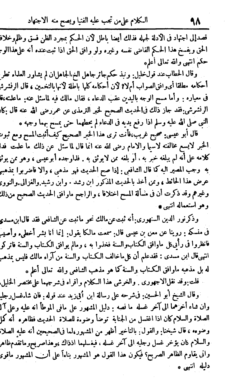 وَقَالَ الْحطاب عِنْد قَول خَلِيل ونبذ حكم جَائِر جَاهِل الخ الْجَاهِل إِن لم يشاور الْعلمَاء تطرح أَحْكَامه مُطلقًا أَي وَافق الصَّوَاب أم لَا لِأَن أَحْكَامه كلهَا بَاطِلَة لِأَنَّهَا بالتخمين قَالَ الرنشرشي فِي معياره وَأما مسح الْوَجْه باليدين عقب الدُّعَاء فَقَالَ مَالك فِيهِ لما سُئِلَ عَنهُ مَا عَلمته قَالَ الرنشرشي فقد جَازَ ذَلِك فِي الحَدِيث الصَّحِيح لخَبر التِّرْمِذِيّ عَن عمر رَضِي الله عَنهُ قَالَ كَانَ النَّبِي صلى الله عَلَيْهِ وَسلم إِذا رفع يَدَيْهِ فِي الدُّعَاء لم يحطهما حَتَّى يمسح بهما وَجهه
