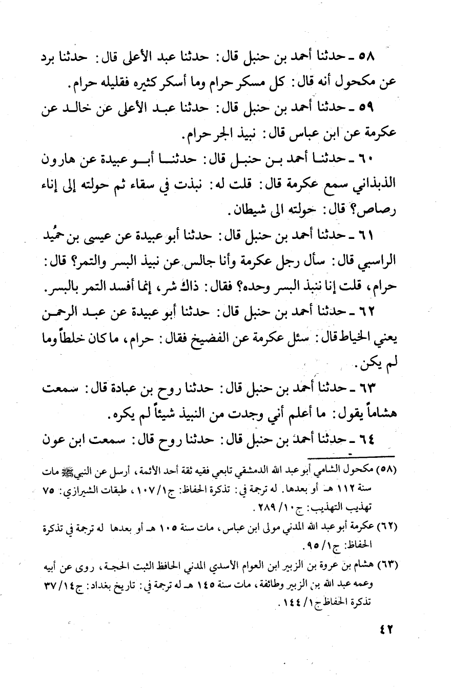 63 - حَدّثَنَا أَحْمَدُ بْنُ حَنْبَلٍ قَالَ: حَدَّثَنَا رَوْحُ بْنُ عُبَادَةَ قَالَ: سَمِعْتُ هِشَامًا يَقُولُ: «§مَا أَعْلَمُ أَنِّي وَجَدْتُ مِنَ النَّبِيذِ شَيْئًا لَمْ يُكْرَهْ»