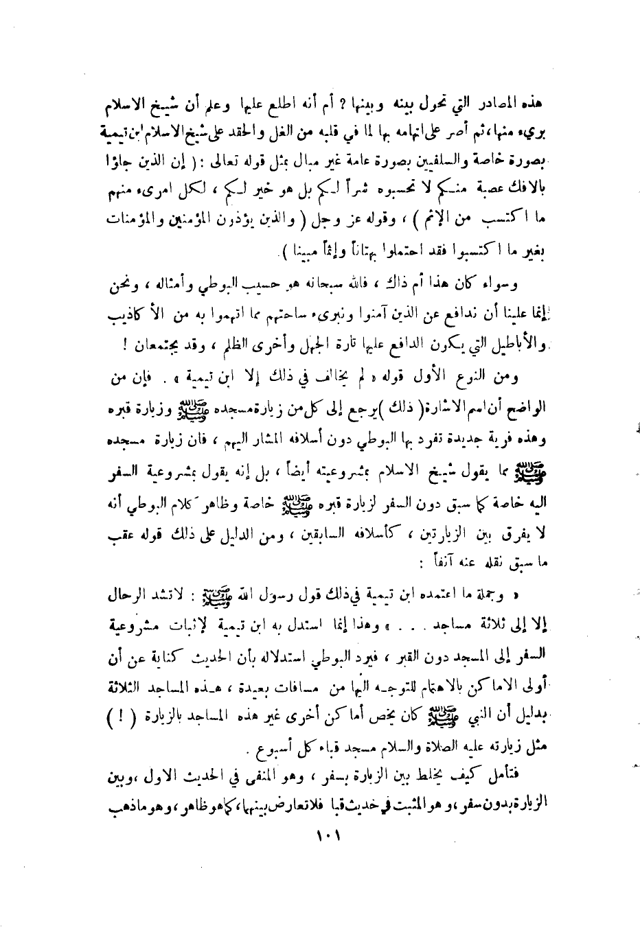 ومن النوع الأول قوله (لم يخالف في ذلك إلا ابن تيمية) . فإن من الواضح أن اسم الإشارة (ذلك) يرجع إلى كل من زيارة مسجده A وزيارة قبره وهذه فرية جديدة تفرد بها البوطي دون أسلافه المشار إليهم فإن زيارة مسجده A مما يقول شيخ الإسلام بمشروعيته أيضا بل إنه يقول بمشروعية السفر إليه خاصة كما سبق دون السفر لزيارة قبره A خاصة وظاهر كلام البوطي أنه لا يفرق بين الزيارتين كأسلافه السابقين ومن الدليل على ذلك قوله عقب ما سبق نقله عنه آنفا: (وجملة ما اعتمده ابن تيمية في ذلك قول رسول الله A: (لا تشد الرحال إلا إلى ثلاثة مساجد. . .) وهذا إنما استدل به ابن تيمية لإثبات مشروعية السفر إلى المسجد دون القبر فيرد البوطي استدلاله بأن الحديث كناية عن أن أولى الأماكن بالاهتمام للتوجه إليها من مسافات بعيدة هذه المساجد الثلاثة بدليل أن النبي A كان يخص أماكن أخرى غير هذه المساجد بالزيارة () مثل زيارته E مسجد قباء كل أسبوع