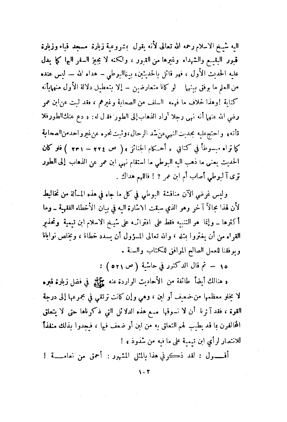 15 - ثم قال الدكتور في حاشية (ص 521) : (هنالك أيضا طائفة من الأحاديث الواردة عنه A في فضل زيارة قبره لا يخلو معظمها من ضعيف أو لين وهي وإن كانت ترتقي في مجموعها إلى درجة القوة فقد آثرنا أن لا نسوقها مع هذه الدلائل التي ذكرناها حتى لا يتعلق المخالفون بما قد يطيب لهم التعلق به من لين أو ضعف فيها فيجدوا بذلك منفذا للانتصار لرأي ابن تيمية على ما فيه من شذوذ)