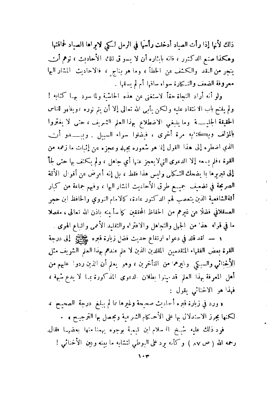 ولو أنه أراد النجاة حقا لاستغنى عن هذه الحاشية ولما سود بها كتابه ولم يفتح باب الانتقاد عليه ولكن يأبى الله تعالى إلا أن يتم نوره ويظهر للناس الحقيقة الجلية وما ينبغي الاضطلاع بهذا العلم الشريف حتى لا يغتروا بالمؤلف وبكتابه مرة أخرى فيضلوا عن سواء السبيل. ويبدو أن الذي اضطره إلى هذا القول إنما هو شعوره بجهله وعجزه عن إثبات ما زعمه من القوة فلم يسعه إلا الدعوى التي لا يعجز عنها أي جاهل ولم يكتف بها حتى لجأ إلى تبريرها بما يضحك الثكلى وليس هذا فقط بل إنه أعرض عن أقوال الأئمة الصريحة في تضعيف جميع طرق الأحاديث المشار إليها وفيهم جماعة من كبار أئمة الشافعية الذين يتعصب لهم الدكتور عادة كالإمام النووي والحافظ ابن حجر العسقلاني فضلا عن غيرهم من الحفاظ المحققين كما سأبينه بإذن الله تعالى مفصلا ما في قوله هذا من الجهل والتجاهل والافتراء والتقليد الأعمى واتباع الهوى