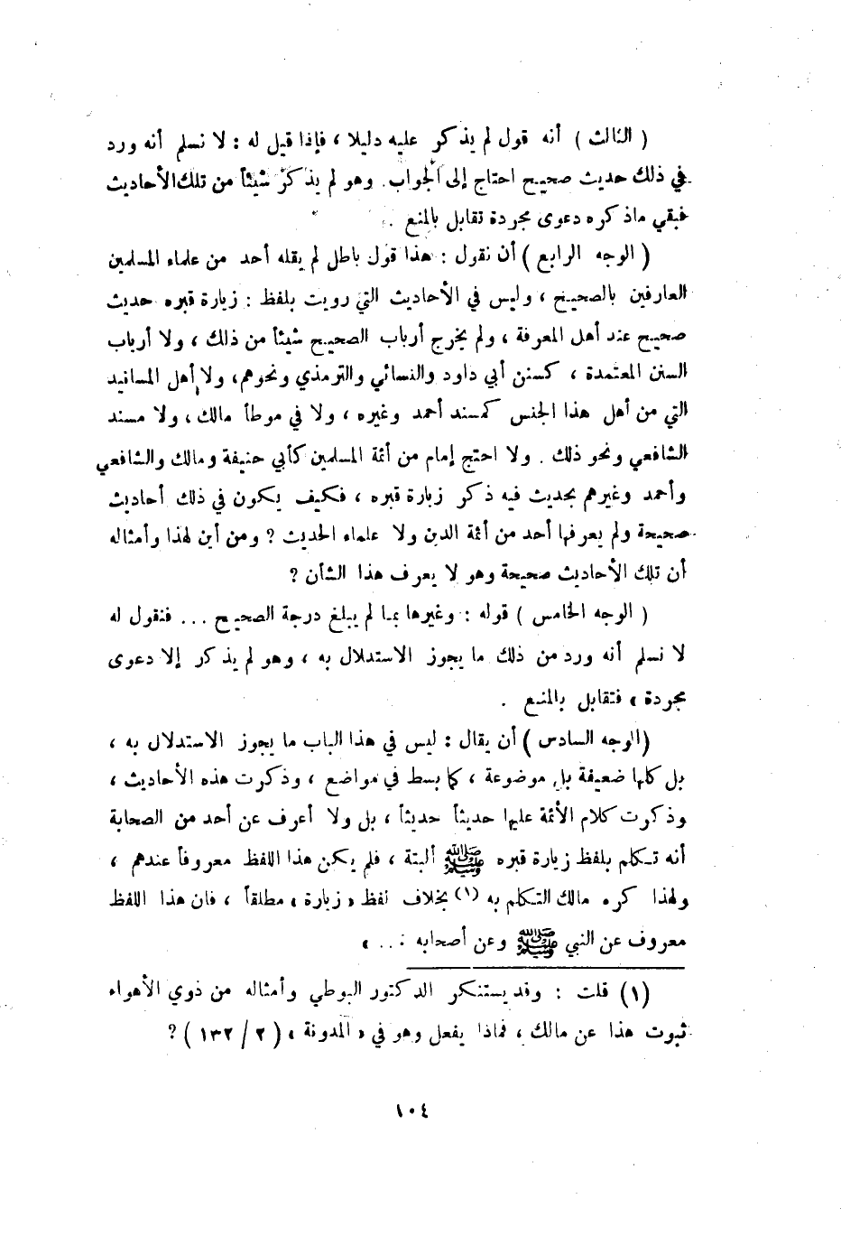 (الوجه الرابع) أن نقول: هذا قول باطل لم يقله أحد من علماء المسلمين العارفين بالصحيح وليس في الأحاديث التي رويت بلفظ: زيارة قبره حديث صحيح عند أهل المعرفة ولم يخرج أرباب الصحيح شيئا من ذلك ولا أرباب السنن المعتمدة كسنن أبي داود والنسائي والترمذي ونحوهم ولا أهل المسانيد التي من أهل هذا الجنس كمسند أحمد وغيره ولا في موطأ مالك ولا مسند الشافعي ونحو ذلك. ولا احتج إمام من أئمة المسلمين كأبي حنيفة ومالك والشافعي وأحمد وغيرهم بحديث فيه ذكر زيارة قبره فكيف يكون في ذلك أحاديث صحيحة ولم يعرفها أحد من أئمة الدين ولا علماء الحديث؟ ومن أين لهذا وأمثاله أن تلك الأحاديث صحيحة وهو لا يعرف هذا الشأن؟