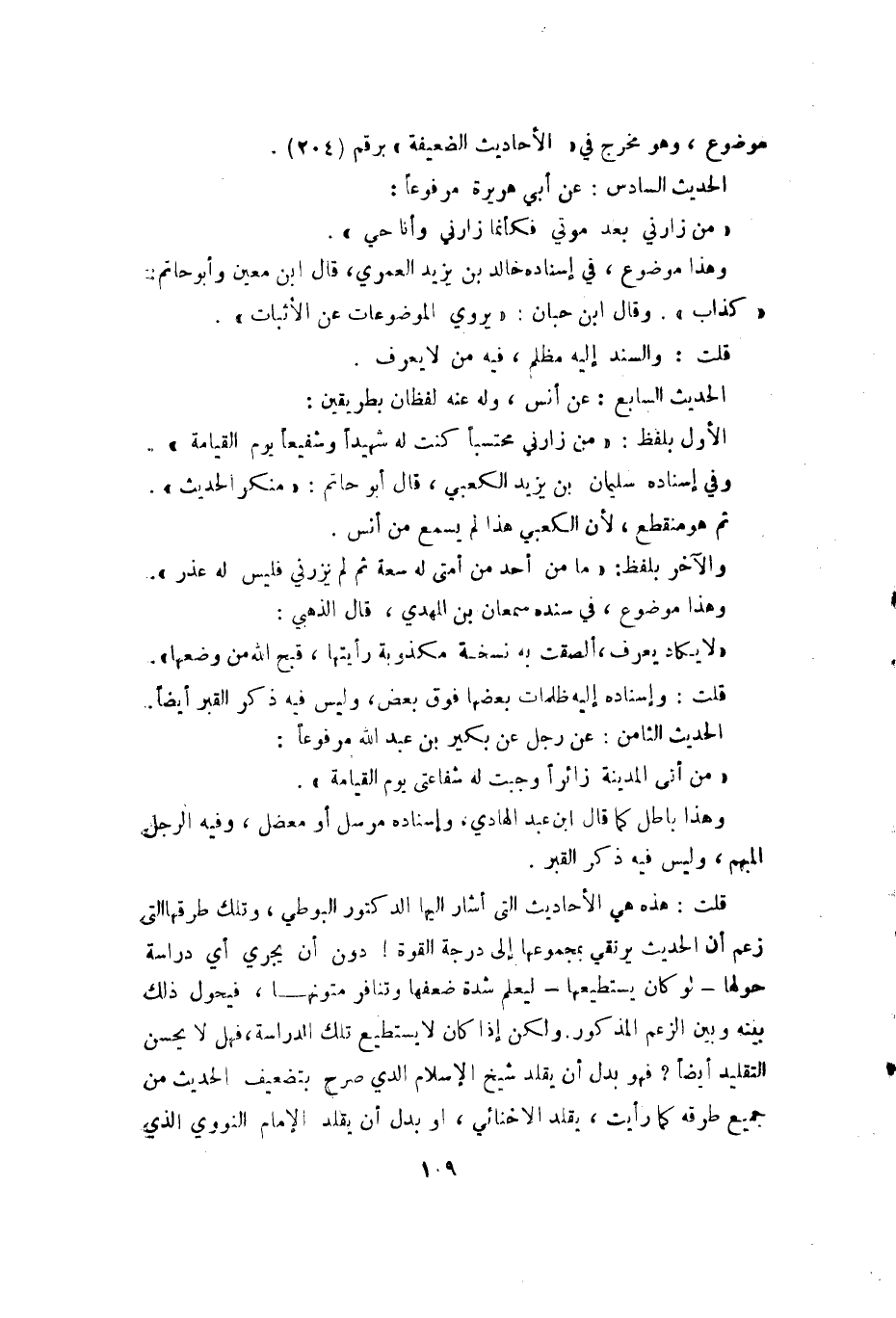 قلت: هذه هي الأحاديث التي أشار إليها الدكتور البوطي وتلك طرقها التي زعم أن الحديث يرتقي بمجموعها إلى درجة القوة دون أن يجري أي دراسة حولها - لو كان يستطيعها - ليعلم شدة ضعفها وتنافر متونها فيحول ذلك بينه وبين الزعم المذكور ولكن إذا كان لا يستطيع تلك الدراسة فهل لا يحسن التقليد أيضا؟ فهو بدل أن يقلد شيخ الإسلام الذي صرح بتضعيف الحديث من جميع طرقه كما رأيت يقلد الأخنائي أو بدل أن يقلد الإمام النووي الذي