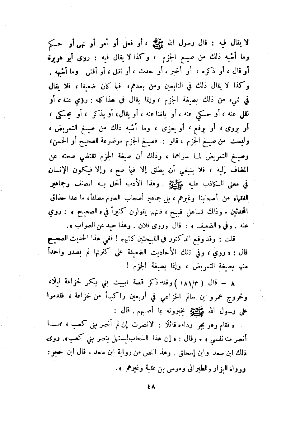 8 - قال (3 / 181) وقد ذكر قصة تبييت بني بكر خزاعة ليلا وخروج عمرو بن سالم الخزاعي في أربعين راكبا من خزاعة فقدموا على رسول الله A يخبرونه بما أصابهم قال: (فقام وهو يجر رداءه قائلا: لا نصرت إن لم أنصر بني كعب مما أنصر منه نفسي) وقال: (إن هذا السحاب ليستهل بنصر بني كعب) روى ذلك ابن سعد وابن إسحاق وهذا النص من رواية ابن سعد. قال ابن حجر: ورواه البزار والطبراني وموسى بن عقبة وغيرهم)