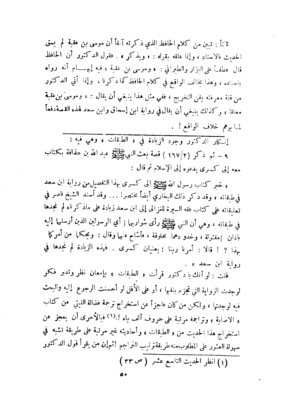 قلت: لو أنك يا دكتور قرأت (الطبقات) بإمعان ونظر وتدبر فكر لوجدت الرواية التي تجزم بنفيها أو على الأقل لو أحسنت الرجوع إليه والبحث فيه لوجدتها ولكن من كان عاجزا عن استخراج ترجمة فضالة الليثي من كتاب (الإصابة) وتراجمه مرتبة على حروف ألف باء (1) فبالأحرى أن يعجز عن استخراج هذا الحديث من (الطبقات) وأحاديثه غير مرتبة على طريقة تشبه في سهولة العثور على المطلوب منه طريقة ترتيب التراجم ثم إن من يقرأ قول الدكتور