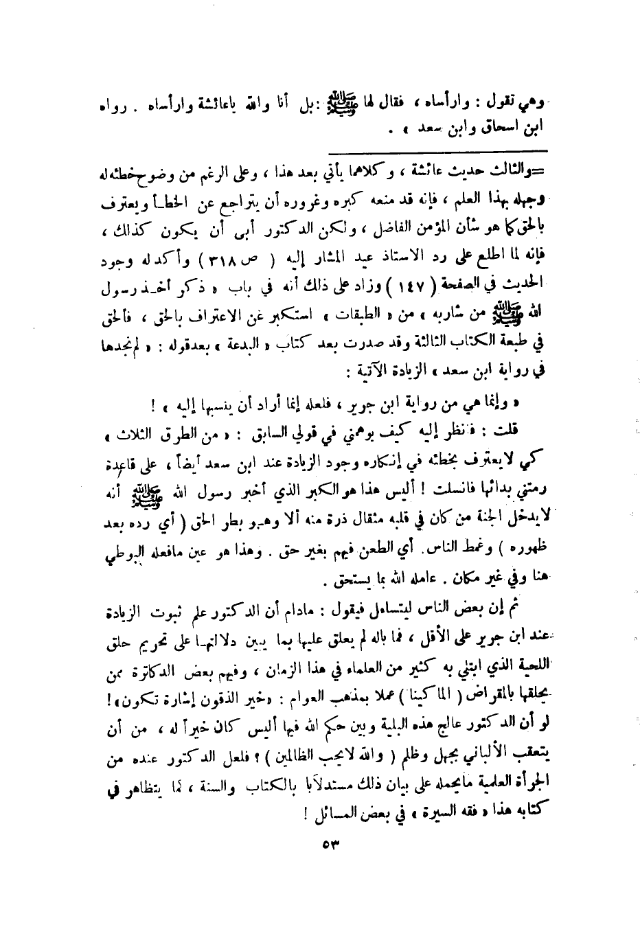 الأولى: اقتصاره في تخريجه على ابن إسحاق وابن سعد وهو يشعر أنه لم يروه من هو أشهر منهما وليس كذلك فقد أخرجه أحمد والدارمي وابن ماجه والدارقطني والبيهقي كما هو مخرج في كتابي (أحكام الجنائز وبدعها) (ص 50 - طبع المكتب الإسلامي)