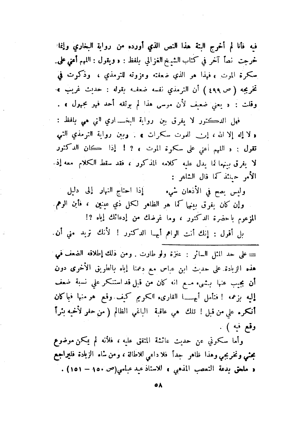 فهل الدكتور لا يفرق بين رواية البخاري التي هي بلفظ: (لا إله إلا الله إن للموت سكرات) . وبين رواية الترمذي التي تقول: (اللهم أعني على سكرة الموت) ؟ إذا كان الدكتور لا يفرق بينهما كما يدل عليه كلامه المذكور فقد سقط الكلام معه إذ الأمر حينئذ كما قال الشاعر: