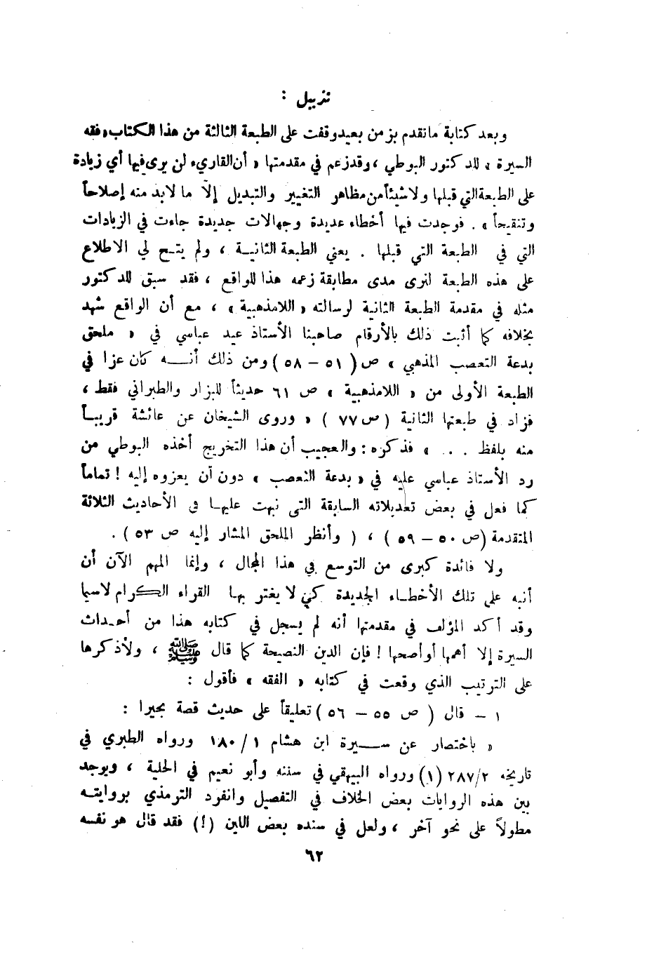 1 - قال (ص 55 - 56) تعليقا على قصة بحيرا: (باختصار عن سيرة ابن هشام 1 / 180 ورواه الطبري في تاريخه 2 / 287 (1) ورواه البيهقي في سننه وأبو نعيم في الحلية ويوجد بين هذه الروايات بعض الخلاف في التفصيل وانفرد الترمذي بروايته مطولا على نحو آخر ولعل في سنده بعض اللين () فقد قال هو نفسه