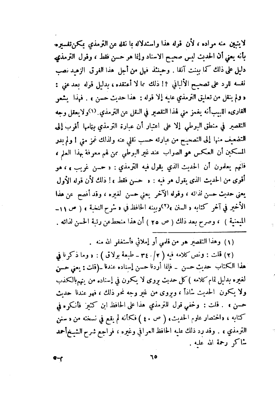 لا يتبين منه مراده لأن قوله هذا واستدلاله بما نقله عن الترمذي يمكن تفسيره بأنه يعني أن الحديث ليس صحيح الإسناد وإنما هو حسن فقط وقول الترمذي دليل على ذلك كما بينت آنفا وحينئذ فهل من أجل هذا الفرق الزهيد نصب نفسه للرد على تصحيح الألباني؟ ذلك مما لا أعتقده بدليل قوله بعد عني: (ولم ينقل من تعليق الترمذي عليه إلا قوله: هذا حديث حسن) . فهذا يشعر القاريء اللبيب أنه يغمز مني لهذا التقصير في النقل عن الترمذي ولا يعقل وجه التقصير في منطق البوطي إلا على اعتبار أن عبارة الترمذي بتمامها أقرب إلى التضعيف منها إلى التصحيح من عبارته حسب نقلي عنه ولذلك غمز مني ولم يدر المسكين أن العكس هو الصواب عند غير البوطي ممن لهم معرفة بهذا العلم فإنهم يعلمون أن الحديث الذي يقول فيه الترمذي: (حسن غريب) هو أقوى من الحديث الذي يقول هو فيه: (حسن فقط) ذلك لأن قوله الأول يعني حديث حسن لذاته وقوله الآخر يعني حسن لغيره وقد أفصح عن هذا الأخير في آخر كتابه (السنن) وبينه الحافظ في (شرح النخبة) (ص 11 - الميمنية) وصرح بعد ذلك (ص 25) أن هذا منحط عن رتبة الحسن لذاته